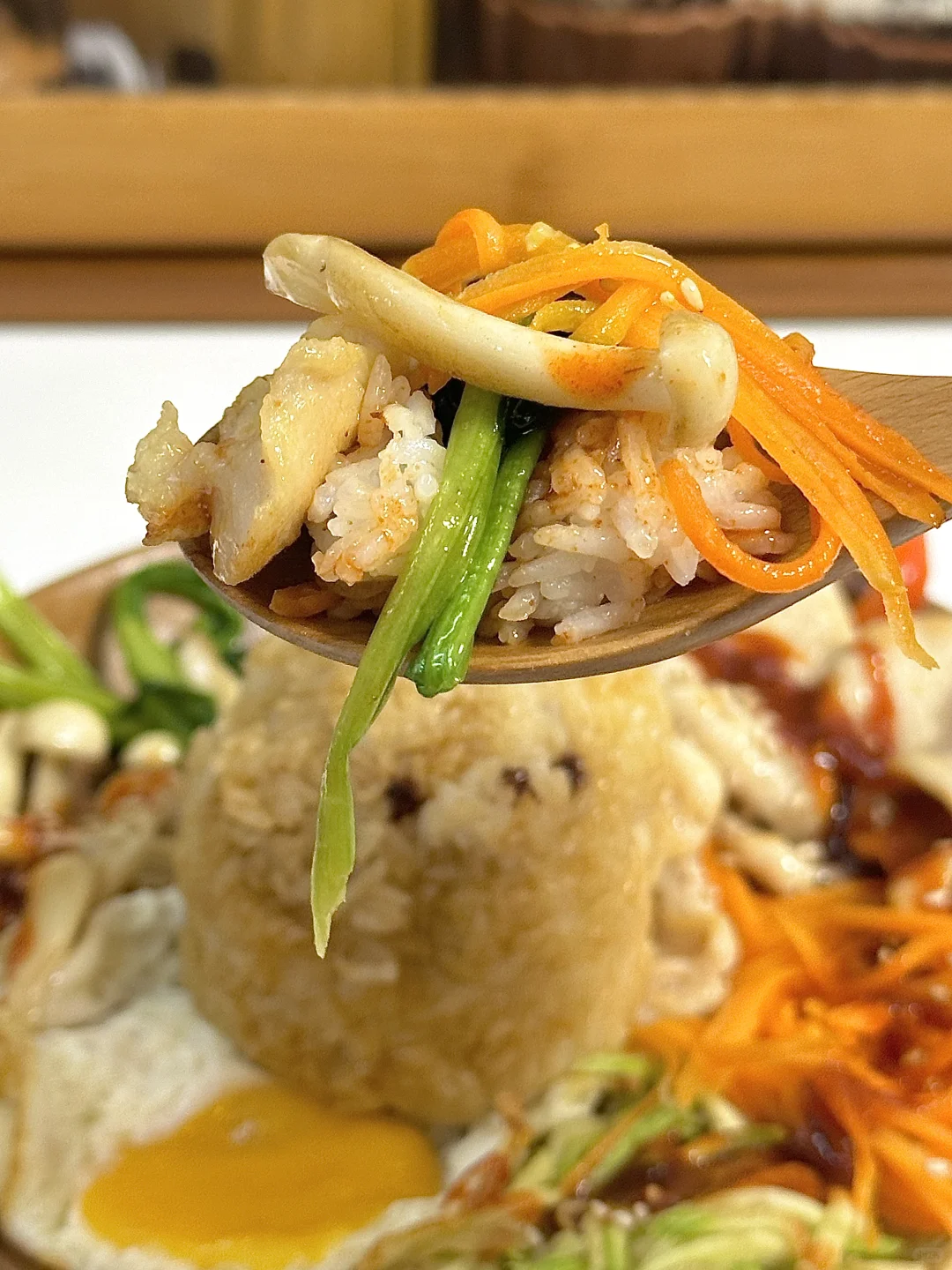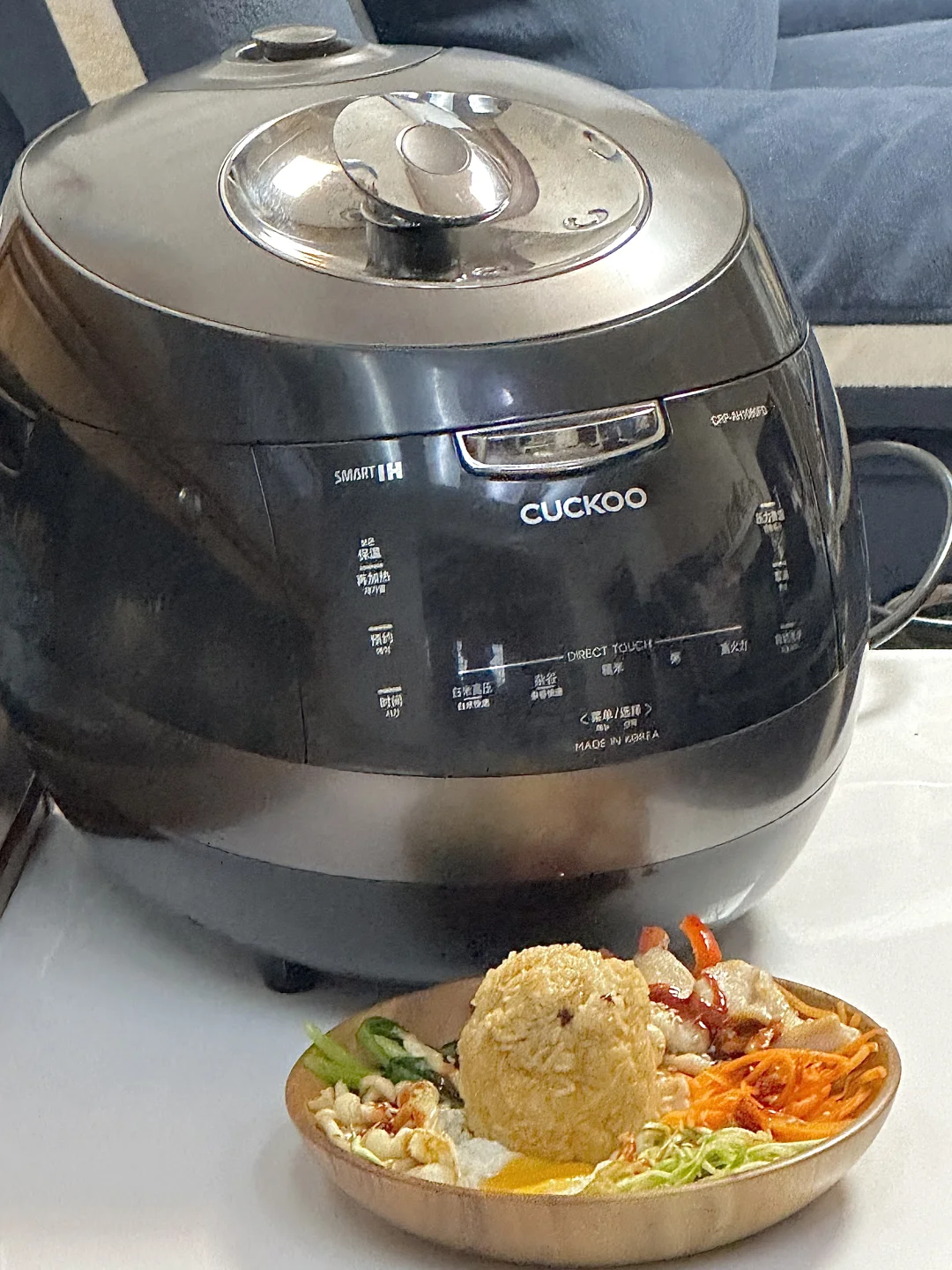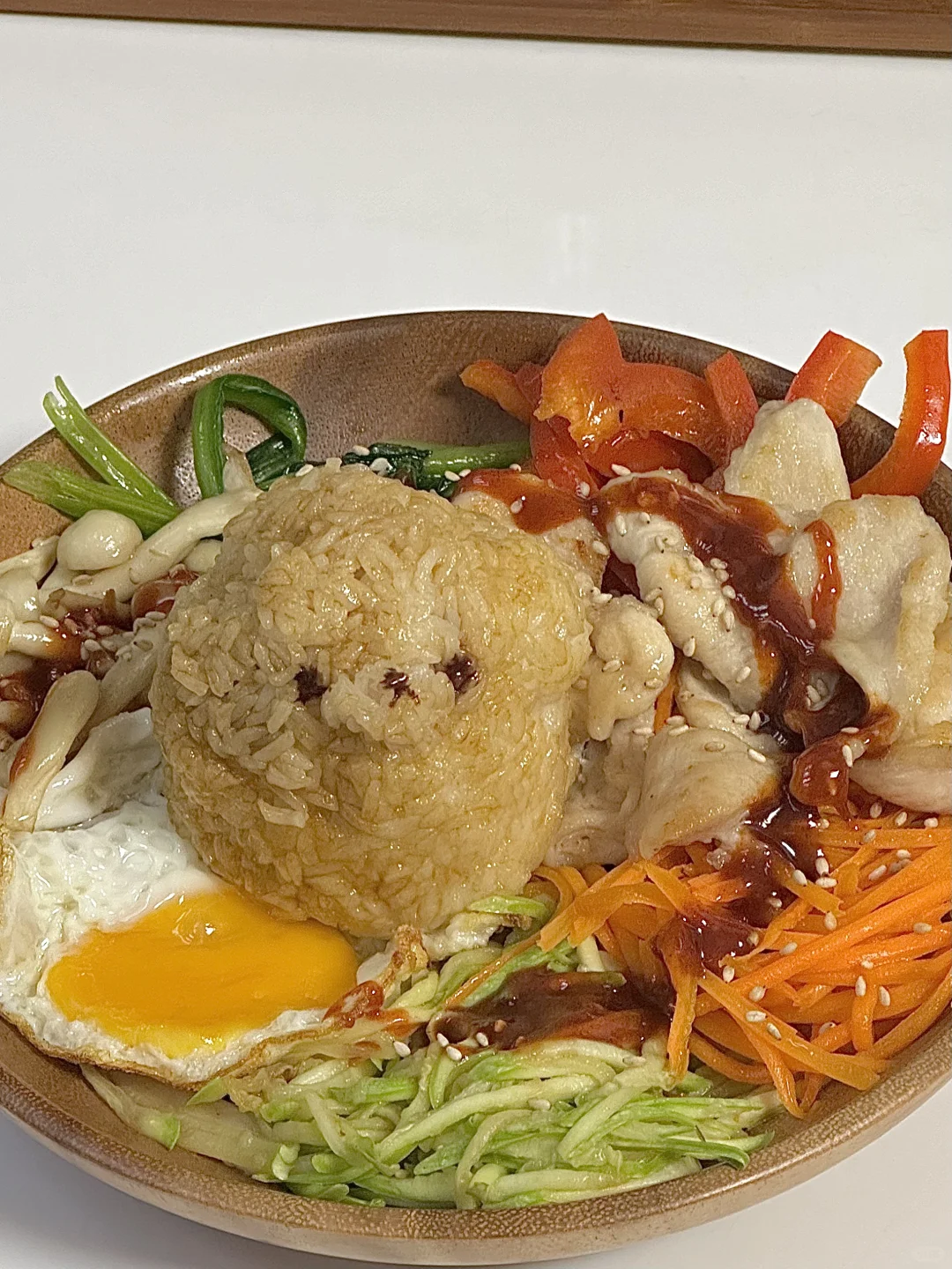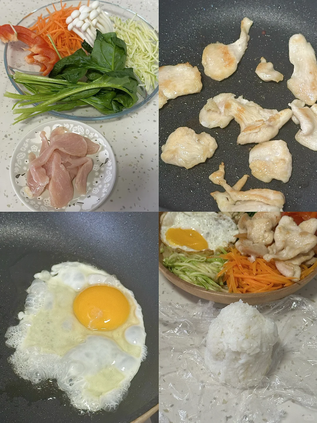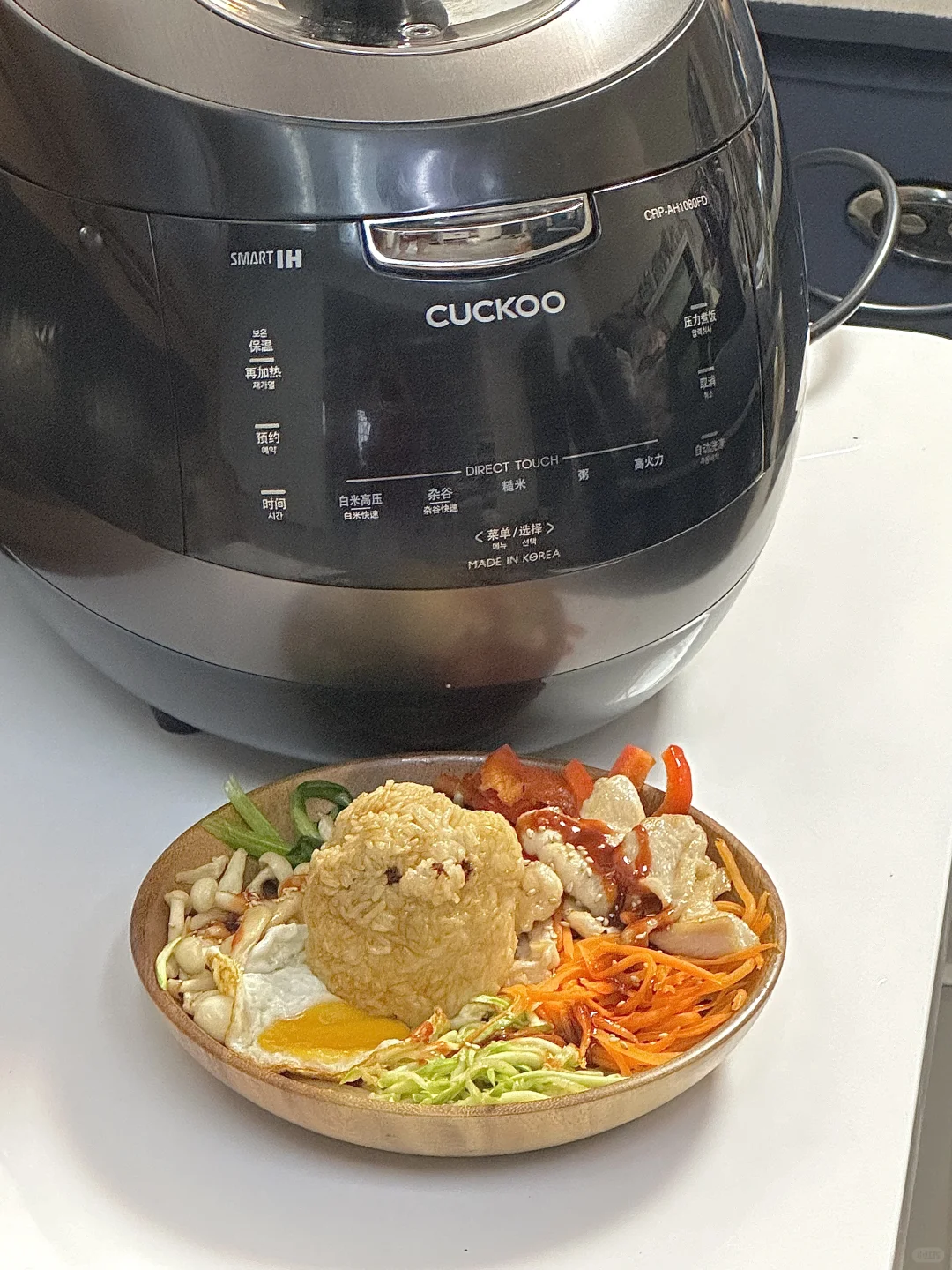 夏天来了真的很没胃口,那就吃点五彩缤纷清爽低脂拌饭吧~ 配料: 鸡蛋、西葫芦、菠菜、甜椒、红萝卜、鸡胸肉(加入盐、胡椒和玉米淀粉腌制)、海鲜菇、拌饭酱、芝麻、米饭(我是用的福库电饭煲蒸的,它有约1.9倍真高压,压力大温度高,很快就可以煮好米饭,煮出来的饭晶莹剔透香甜软糯~而且有多种料理功能,蒸炖煮都能做!还有预约和自动洗涤功能!很贴心的是排蒸汽的时候是通过旋转蒸汽帽以S型曲线轻柔排出,an全便利!) 1.腌好的鸡胸肉煎熟,再煎鸡蛋 2.其他配菜分别炒熟 3.米饭蒸熟后捏成狗狗形状,再在表面刷上一层酱油 4.巧克力画表情 5.组合!
