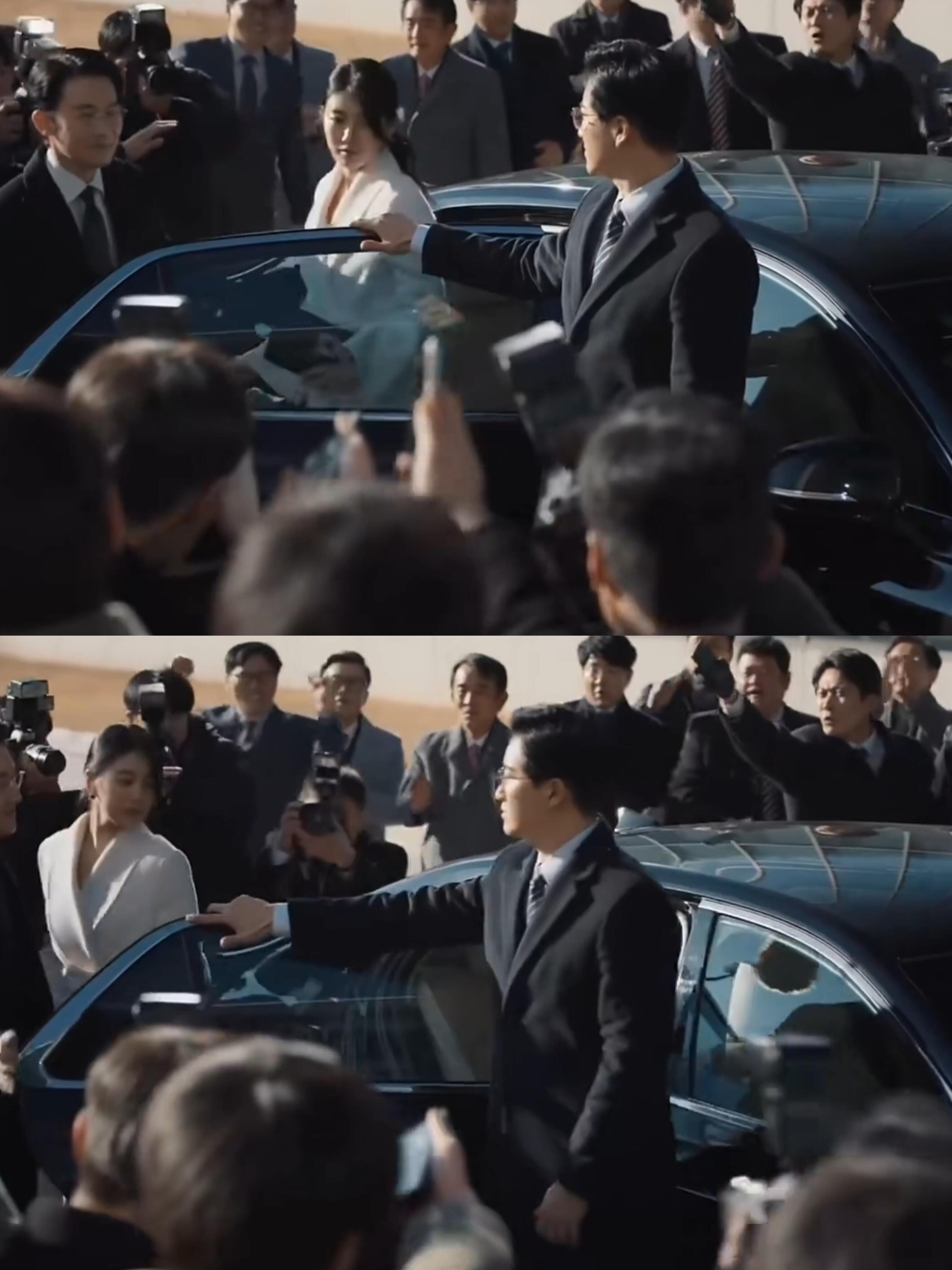 丈夫先从车上下来,拉着女主的手,女主出了车,不知道的人以为他们好恩爱,一堆客气话后,丈夫成功了,成为候选人女主也安排上去献花