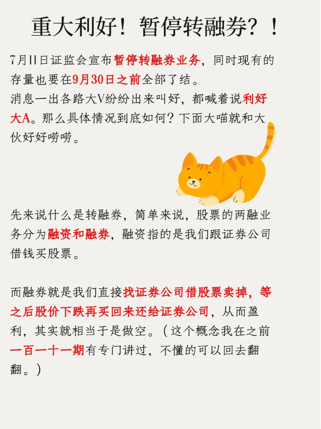 7月11日证监会宣布暂停转融券业务,同时现有的存量也要在9月30日之前全部了结。消息一出各路大V纷纷出来叫好,都喊着说利好大A。那么具体情况到底如何?下面大喵就和大伙好好唠唠。