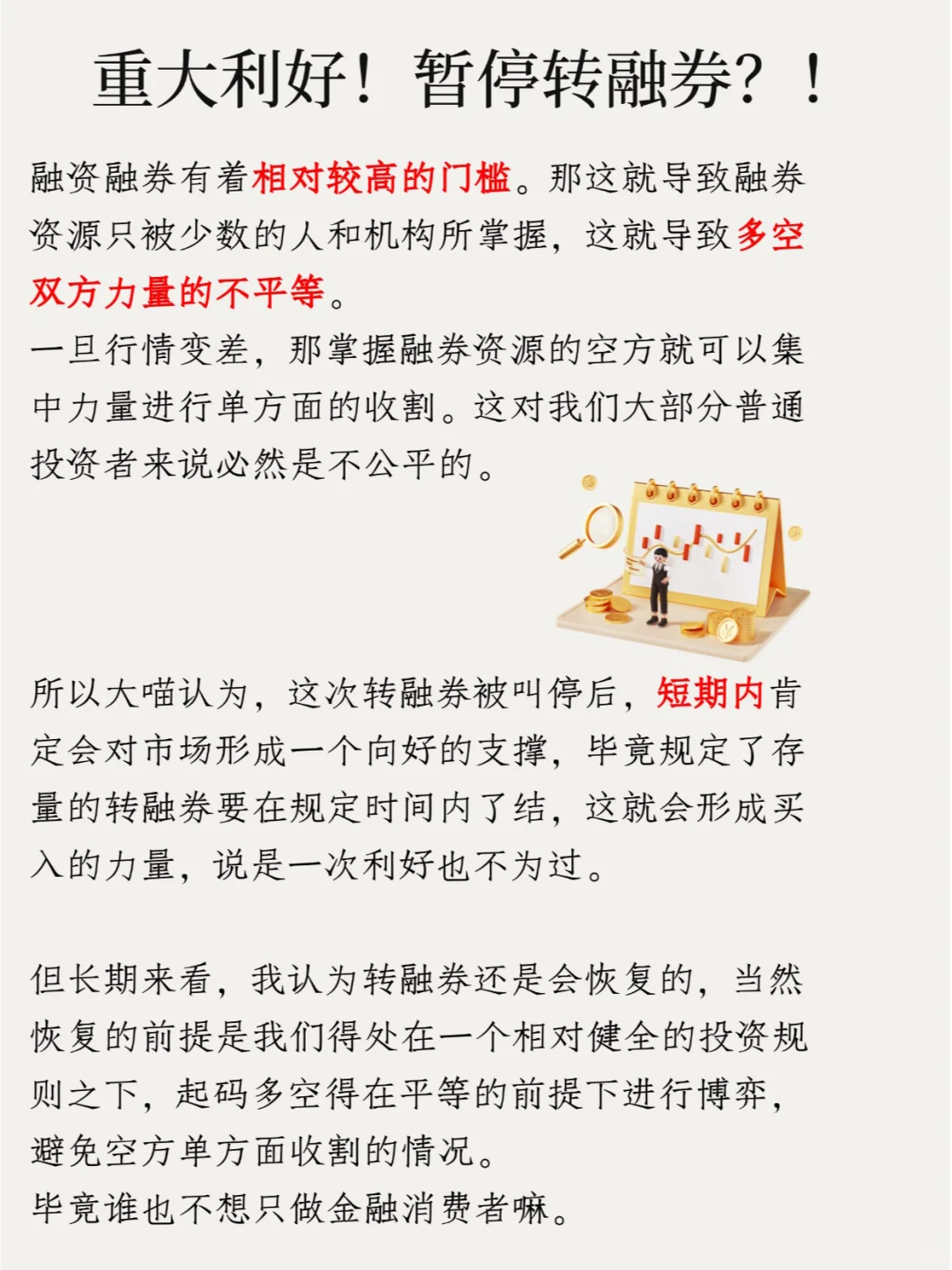 但长期来看,我认为转融券还是会恢复的,当然恢复的前提是我们得处在一个相对健全的投资规则之下,起码多空得在平等的前提下进行博弈,避免空方单方面收割的情况。毕竟谁也不想只做金融消费者嘛。