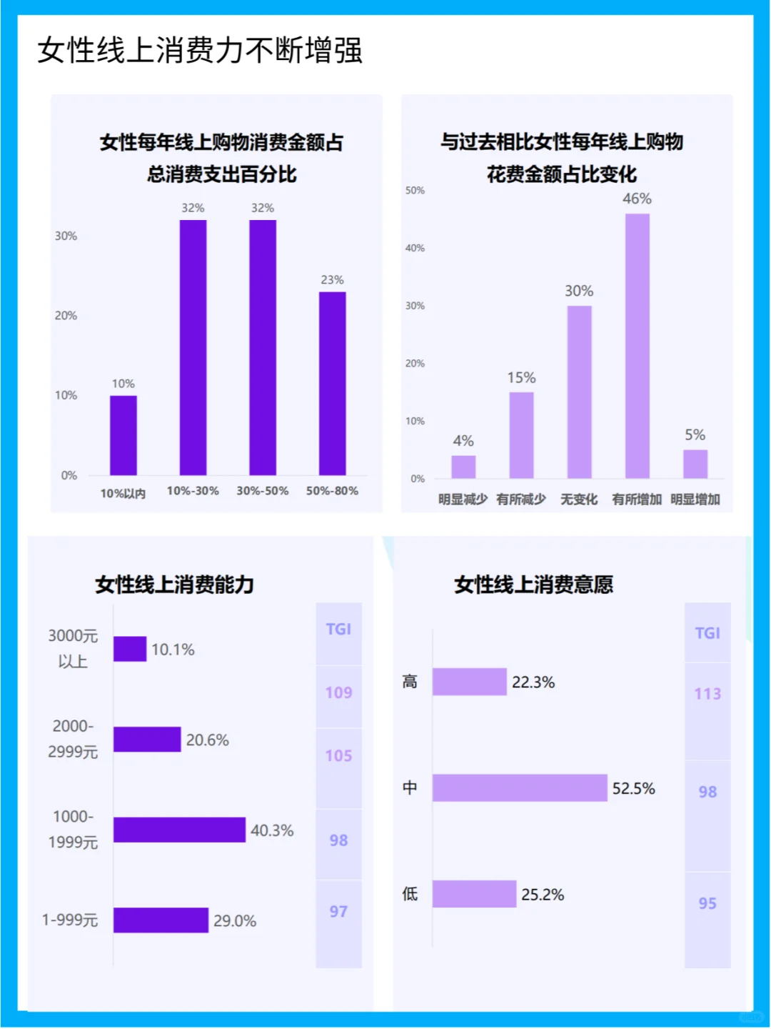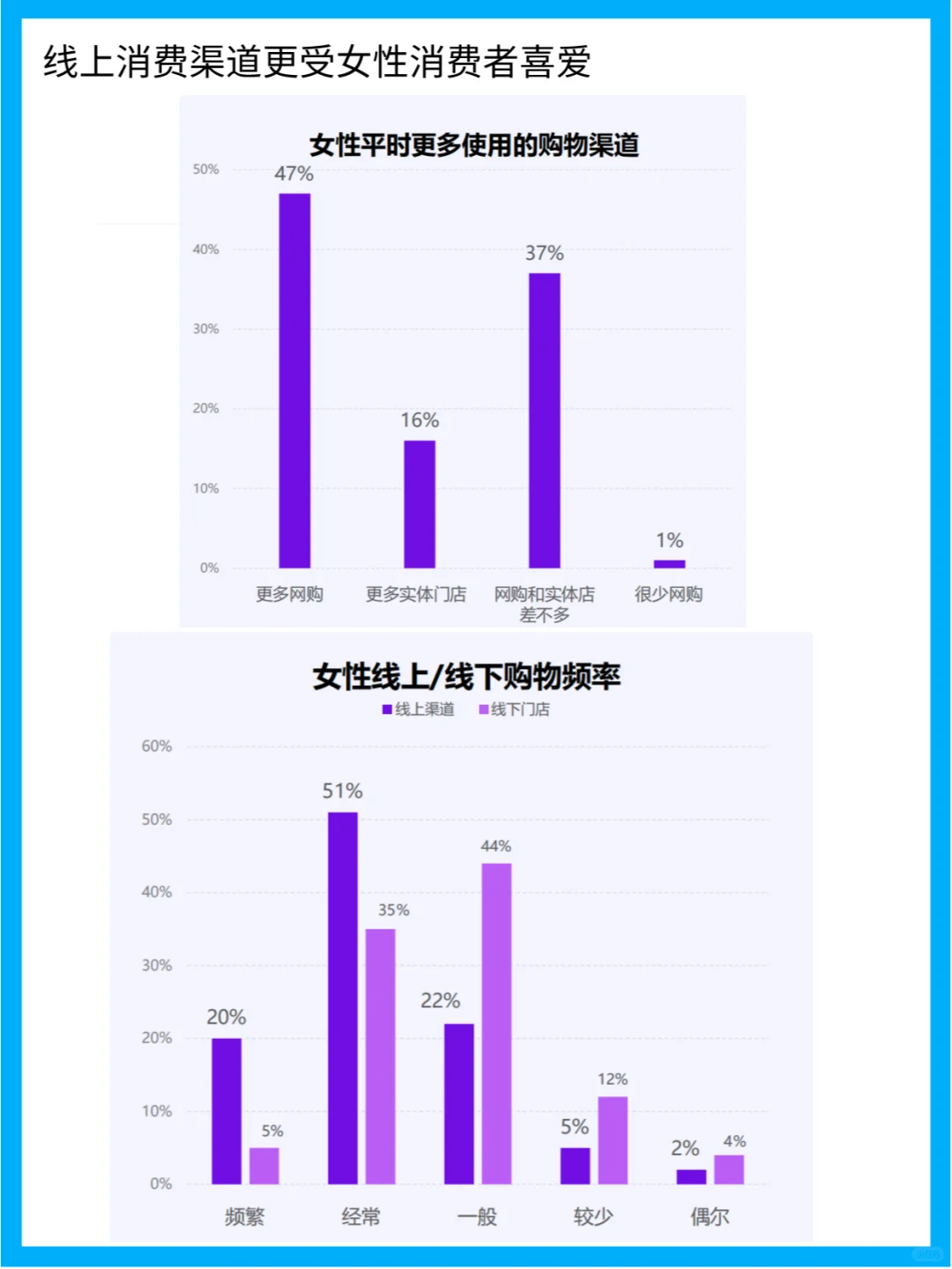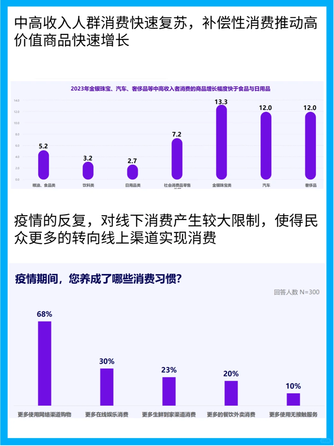 经济增长的稳健基石:中国的GDP增速达到5.20%,人均GDP增速为5.40%,这不仅展现了中国经济的韧性,也为消费市场提供了坚实的增长基础。 消费市场的主导力量:消费支出对经济增长的贡献率高达82.5%,社会消费品零售总额同比增长7.2%,突显了消费在经济中的中心地位。 理性消费的兴起:33%的消费者在疫情期间更加重视性价比,这表明消费者的购买行为正变得更加谨慎和理性。 电商零售的新活力:线上实物商品零售占比达到27.6%,特别是服装服饰,成为电商的主要品类,这一趋势在、京东、天猫等平台尤为明显。 女性消费力的崛起:女性线上消费意愿强烈,51%的女性受访者表示线上消费金额占比有所增加,女性消费者在线上购物的频次和金额都有显著提升。 跨境电商的全球机遇:在全球市场的不确定性中,跨境电商贸易国数量达到697个,天猫在海外电商中占据主导地位,显示了中国品牌的国际竞争力。 即时零售的无缝体验:线上线下融合的即时零售模式正在兴起,消费者对个性化和体验的需求不断增长,零售商需提供无缝衔接的购物体验。 数字化洞察的力量:数字100的全栈式消费者调研与洞察平台,通过48小时快速完成行业专业洞察分析,为市场营销过程提供决策支持。