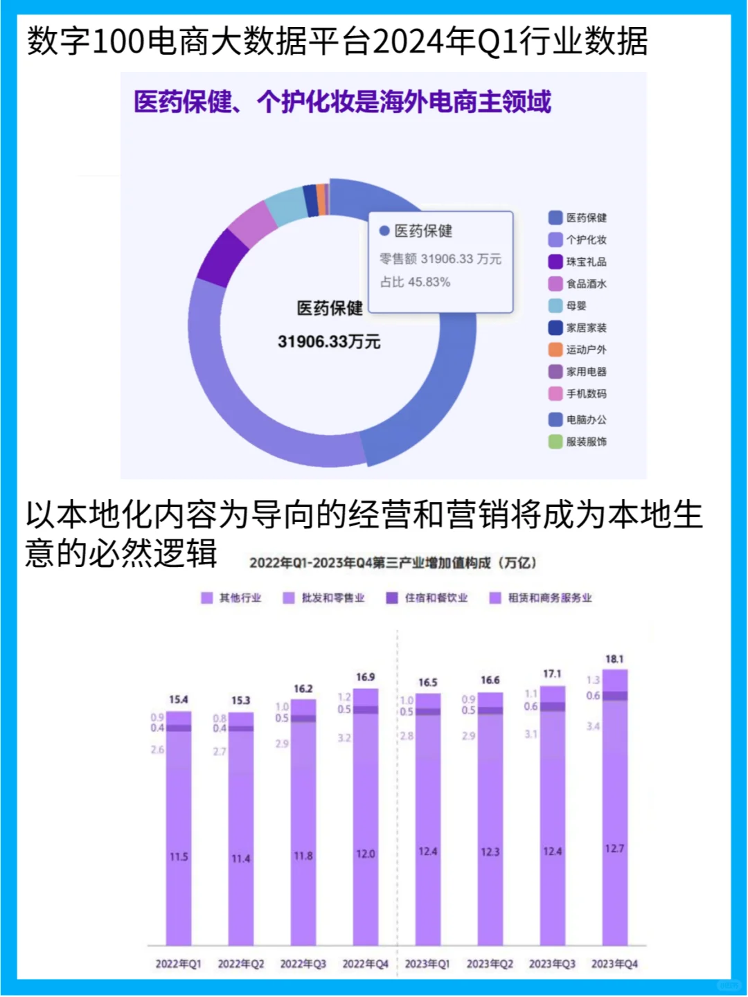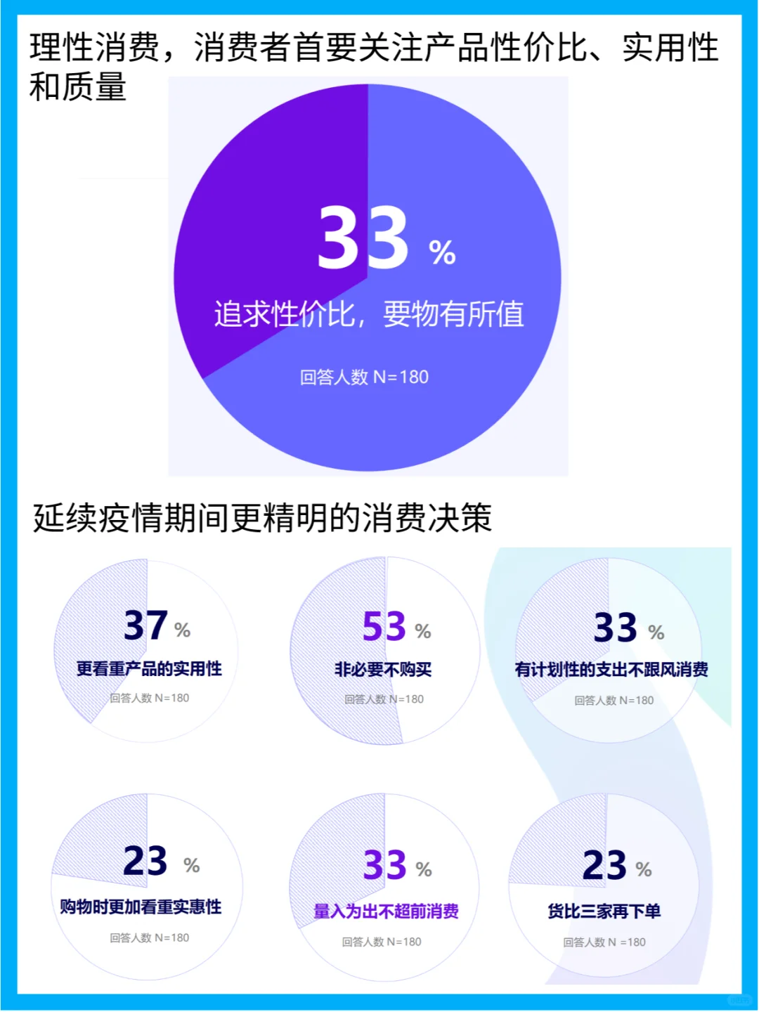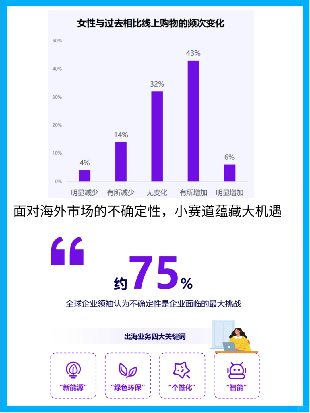 经济增长的稳健基石:中国的GDP增速达到5.20%,人均GDP增速为5.40%,这不仅展现了中国经济的韧性,也为消费市场提供了坚实的增长基础。 消费市场的主导力量:消费支出对经济增长的贡献率高达82.5%,社会消费品零售总额同比增长7.2%,突显了消费在经济中的中心地位。 理性消费的兴起:33%的消费者在疫情期间更加重视性价比,这表明消费者的购买行为正变得更加谨慎和理性。 电商零售的新活力:线上实物商品零售占比达到27.6%,特别是服装服饰,成为电商的主要品类,这一趋势在、京东、天猫等平台尤为明显。 女性消费力的崛起:女性线上消费意愿强烈,51%的女性受访者表示线上消费金额占比有所增加,女性消费者在线上购物的频次和金额都有显著提升。 跨境电商的全球机遇:在全球市场的不确定性中,跨境电商贸易国数量达到697个,天猫在海外电商中占据主导地位,显示了中国品牌的国际竞争力。 即时零售的无缝体验:线上线下融合的即时零售模式正在兴起,消费者对个性化和体验的需求不断增长,零售商需提供无缝衔接的购物体验。 数字化洞察的力量:数字100的全栈式消费者调研与洞察平台,通过48小时快速完成行业专业洞察分析,为市场营销过程提供决策支持。