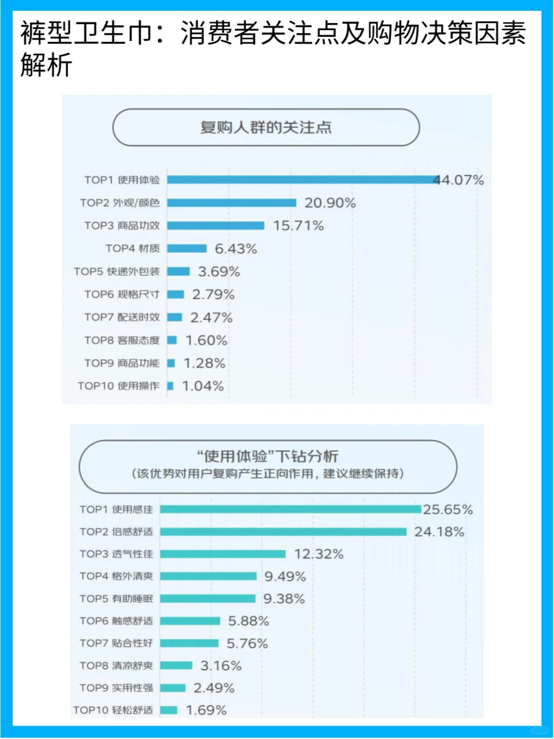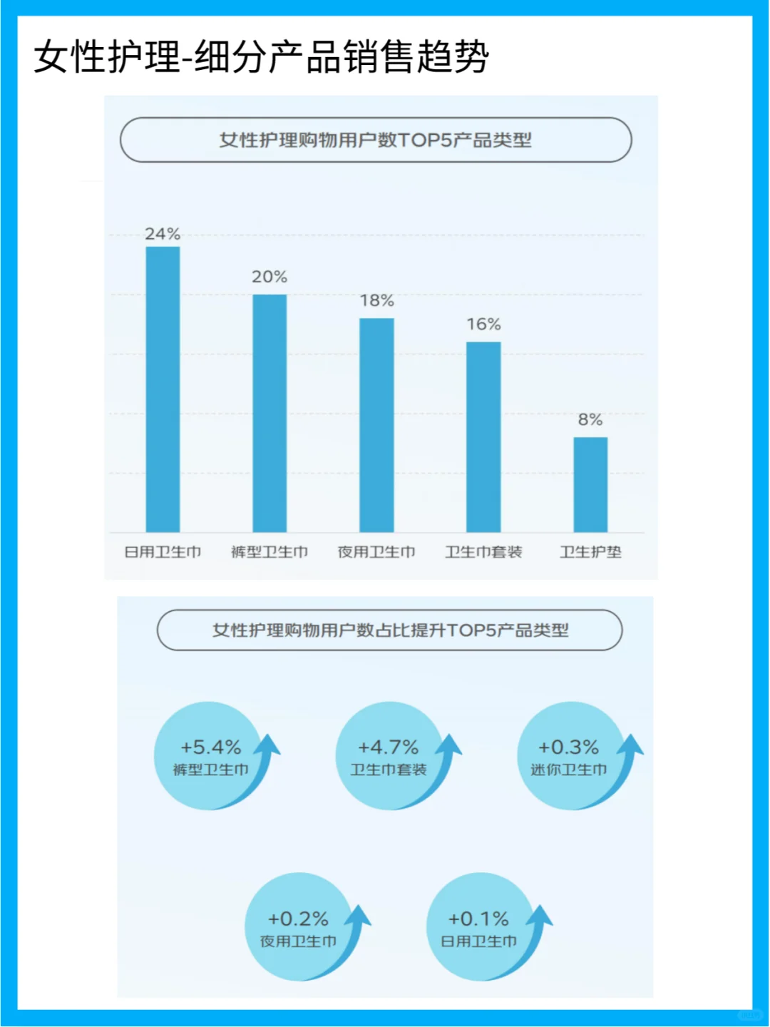 女性护理趋势:裤型卫生巾、卫生巾套装增速快,消费者关注透气性、快速吸收等特性。