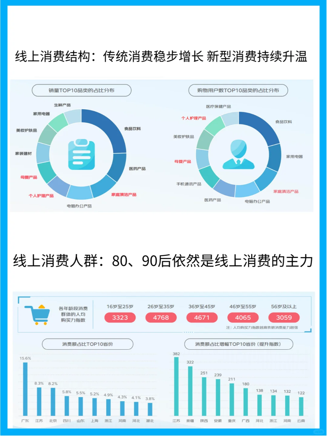 品类增长显著:家庭清洁产品、食品饮料、医药产品位列销量TOP3,而购物用户数TOP3品类则是家庭清洁产品、食品饮料和医药产品。