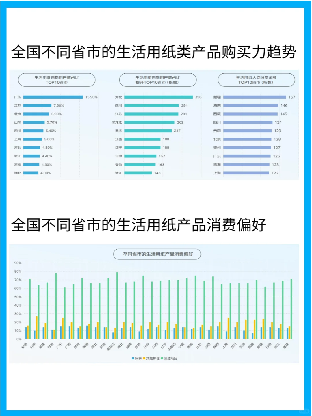 消费额占比省份:广东、江苏、北京等省市生活用纸购物用户数集中,河北、四川、江苏等省市增长潜力大。