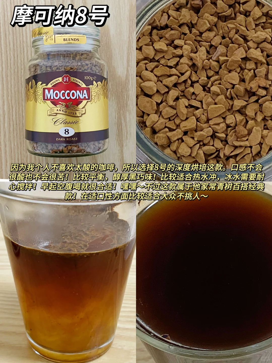 因为我个人不喜欢太酸的咖啡,所以选的8号深度烘培的这款,口感不会很酸也不会很苦,比较平衡,醇厚的黑巧味,比较适合热水冲,冰水需要耐心搅拌~