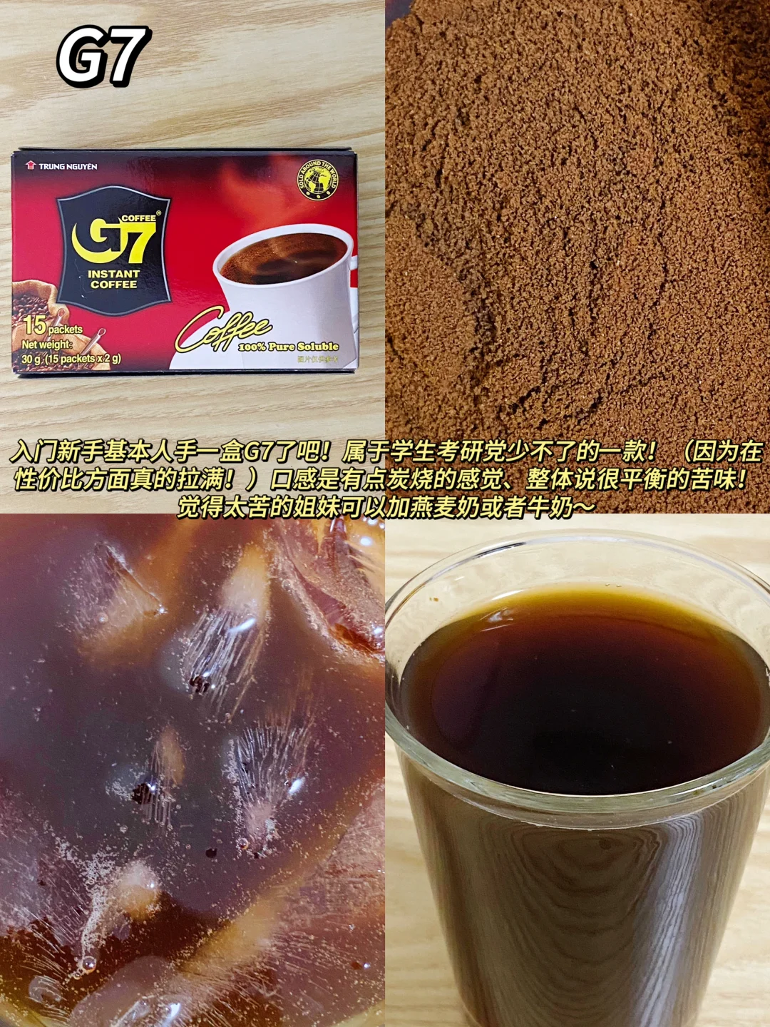 入门新手基本人手一盒g7了吧!!属于学生党考研党少不了的一款!(因为在性价比方面真的拉满!!)口感是有点炭烧的感觉,整体是很平衡的苦味,觉得太苦的姐妹可以加燕麦奶或者牛奶!