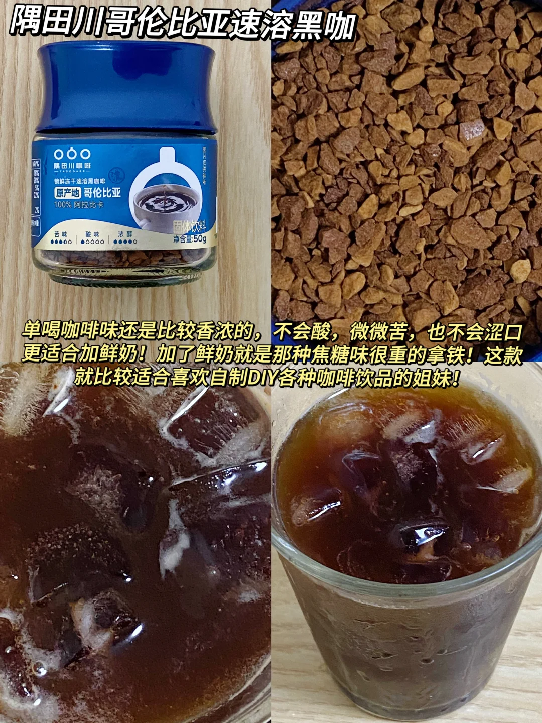 单喝咖啡味还是比较香浓的,不会酸,微微苦,也不会涩口,更很适合加鲜奶!加了鲜奶就是那种焦糖味贼重的拿铁,这款就比较适合喜欢自制diy各种咖啡饮品的姐妹~