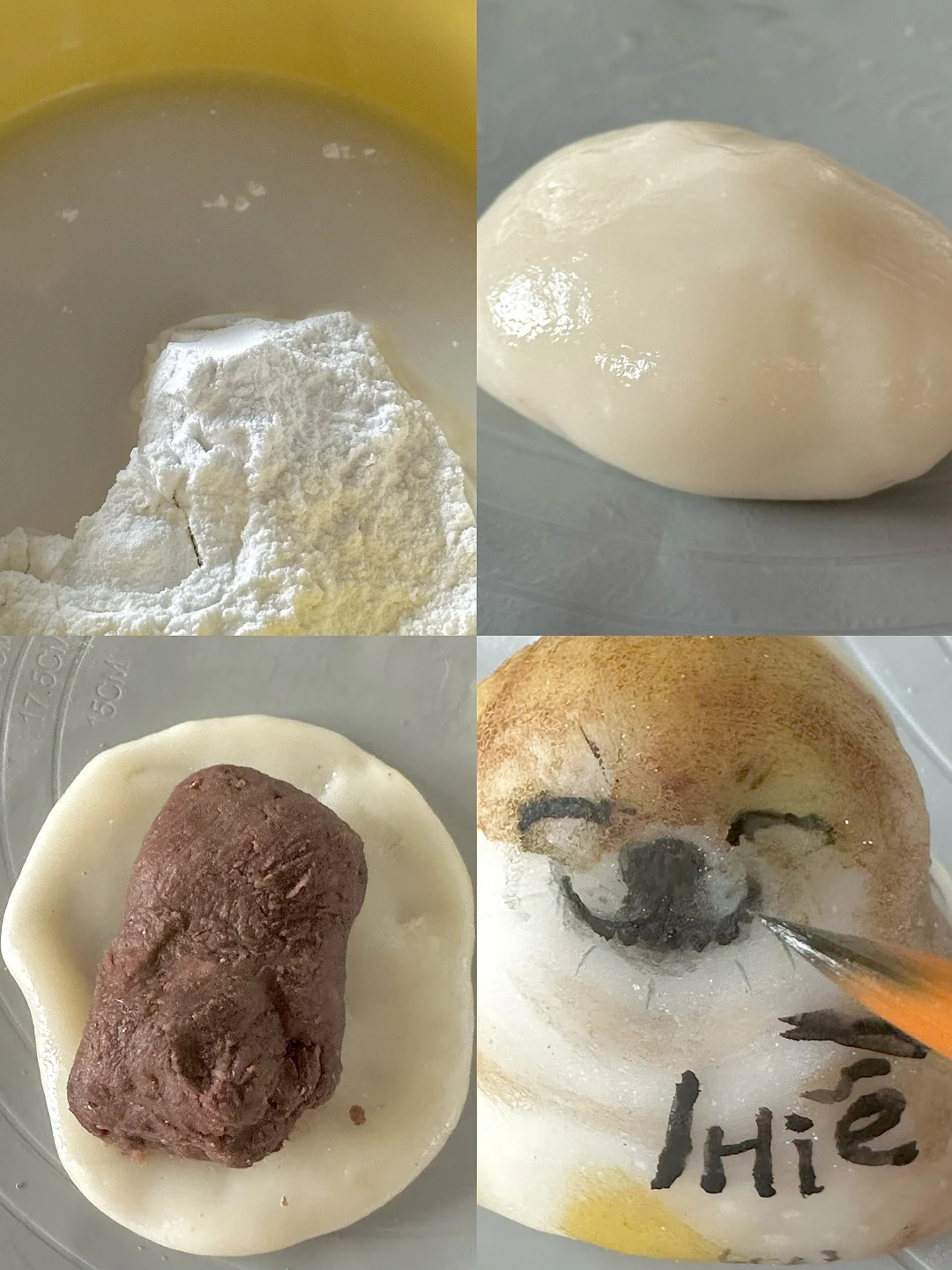 2.面垫抹油,糯米团揉光滑,包入馅料,用色素画上表情