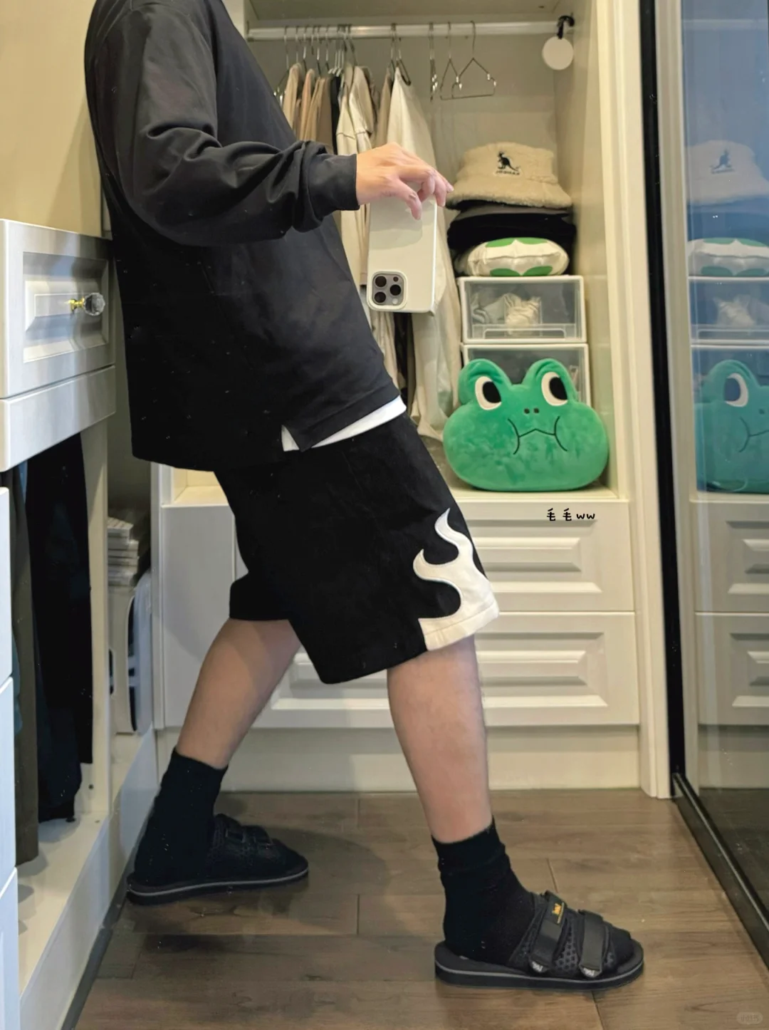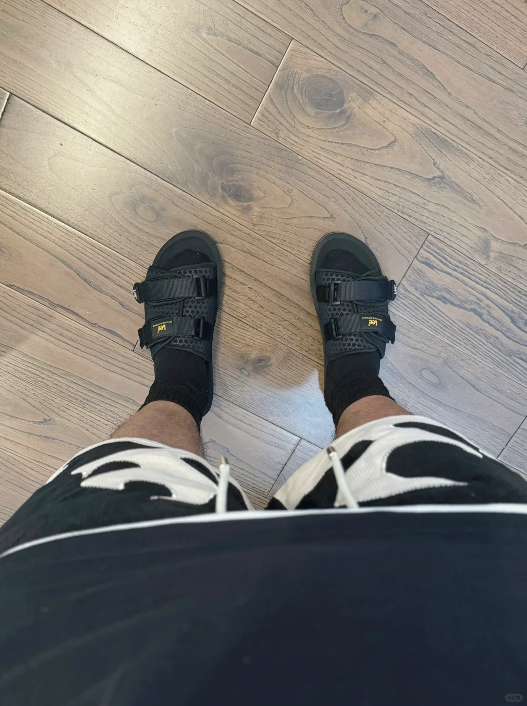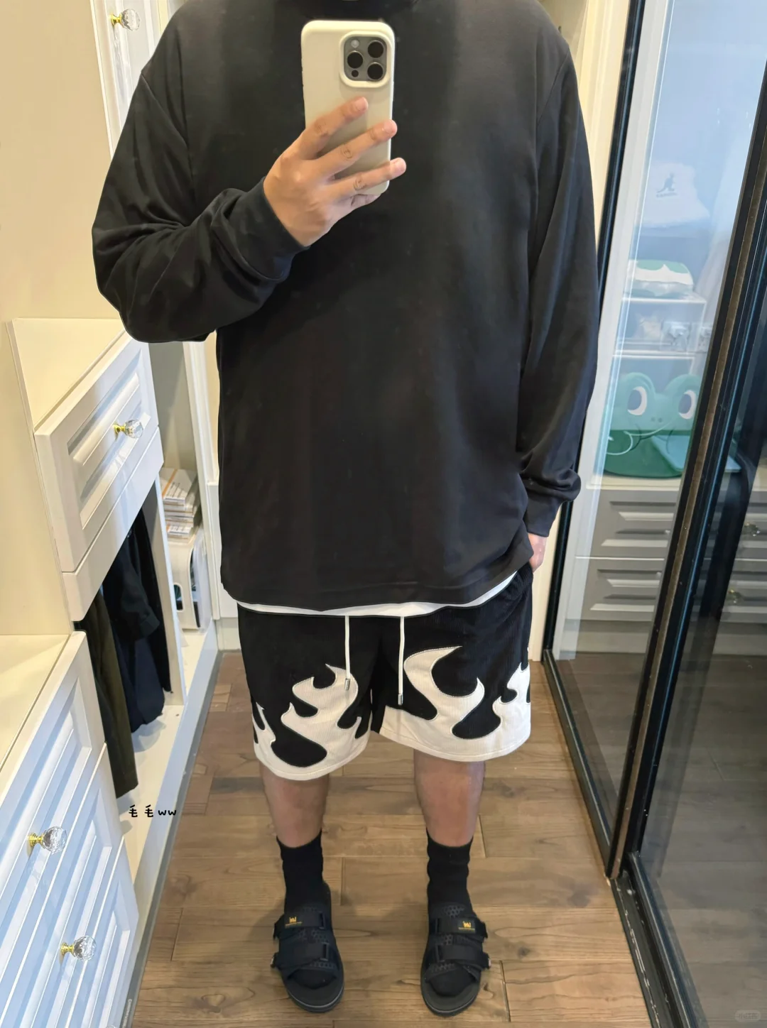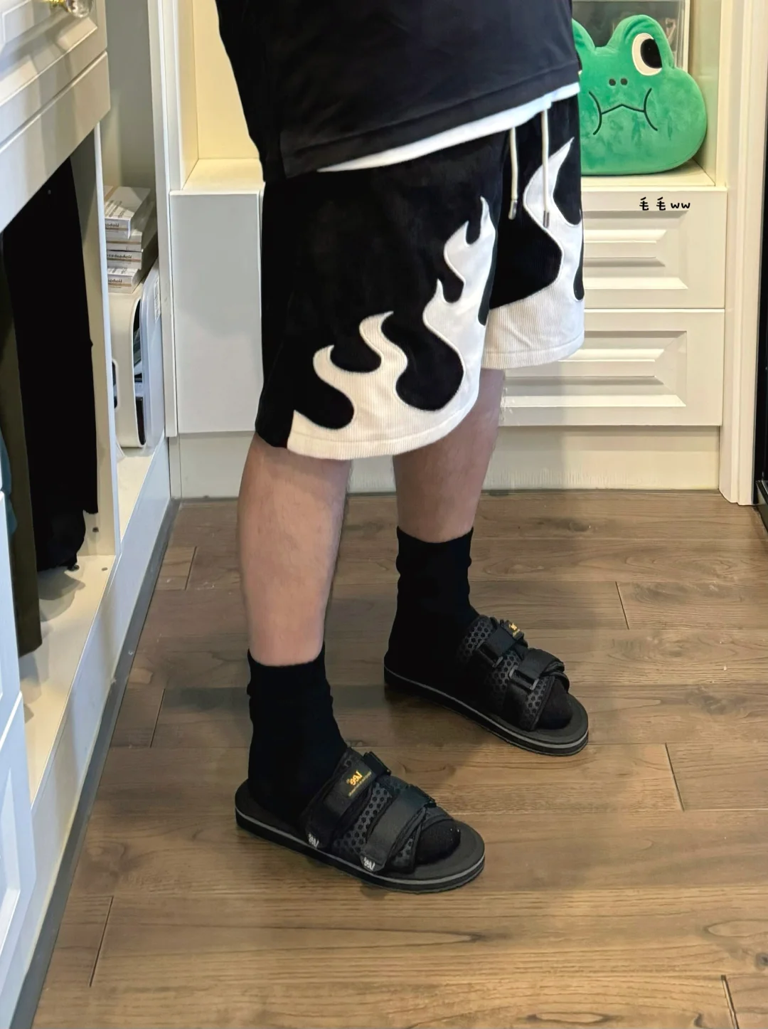 -单调的all black穿搭,来点不一样小细节 -火焰图案非常醒目,做个黑白色层次感 -拖鞋与长袜组合,适合夏末秋初的搭配 . —————— . ✏️本人178cm75kg 球鞋尺码265mm(正常EU42) . 💭以上均为我个人观点,不喜勿喷,欢迎讨论。