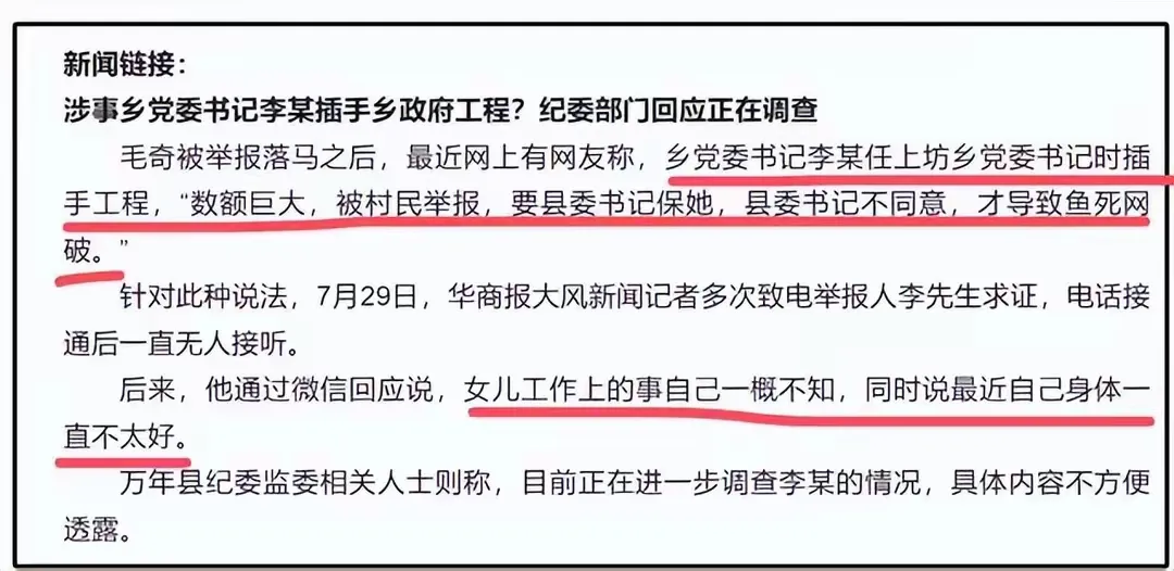 李佩霞被调查后,她老爸发现了佩奇的音频资料,前后找了毛奇书记三次,毛奇也答应宽大处理,还帮她争取主动交代问题。但事情一直没解决,李佩霞的老爸就上网举报了。