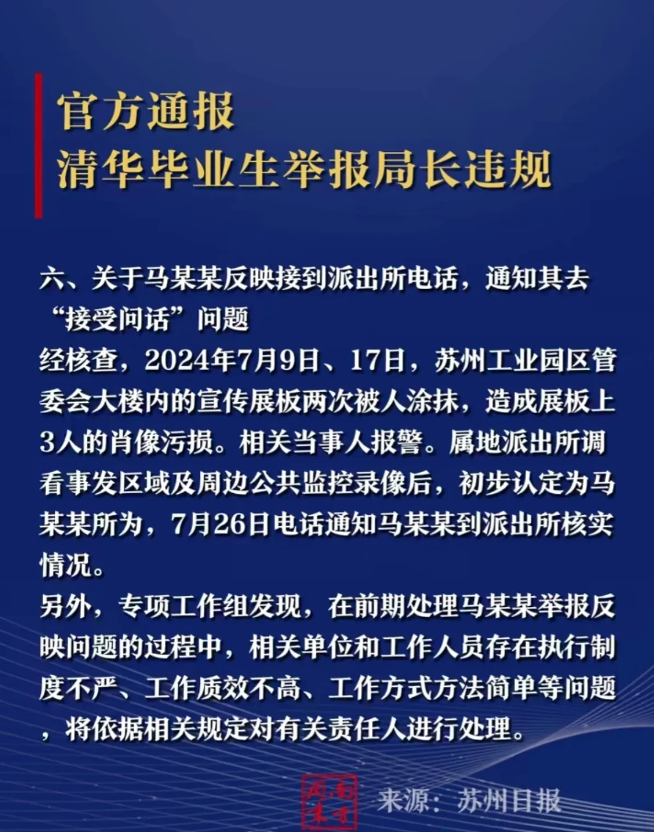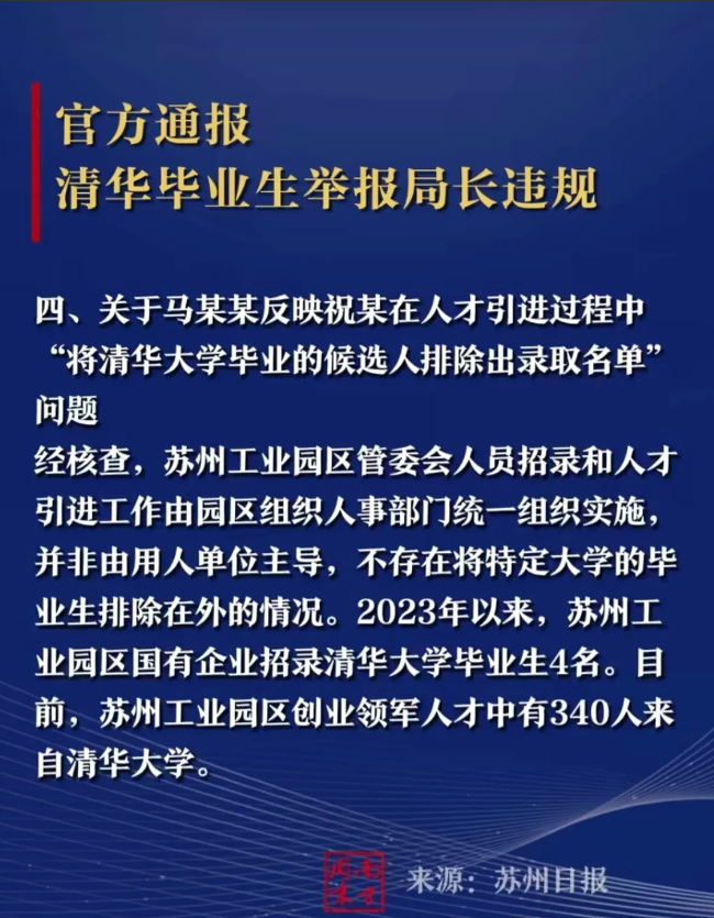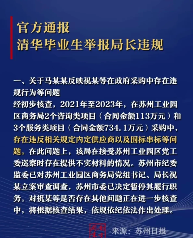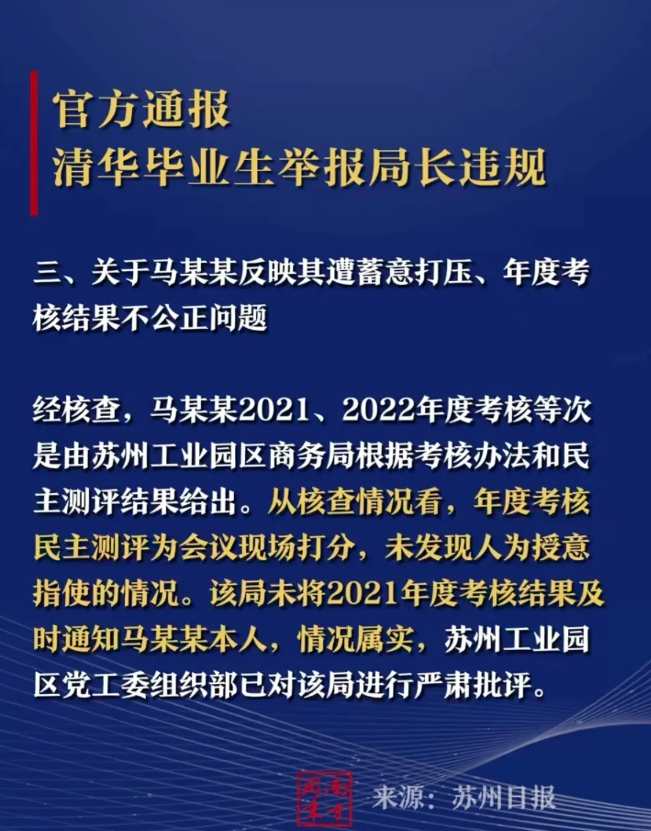 苏州那边的调查结果出来了! 1. 确实有人操纵合同串标,接下来还会继续查。 2. 局长的学历是清白的,没问题。 3. 没发现有人故意指使或者打压谁,就是没及时告诉马某年度考核的结果。 4. 说清华毕业生“不上路子”那是谣言,招聘时没有特意排除某个学校。 5. 在处理马某那件事的时候,确实有点马虎、方法简单、效率不高,这些问题以后会改正。