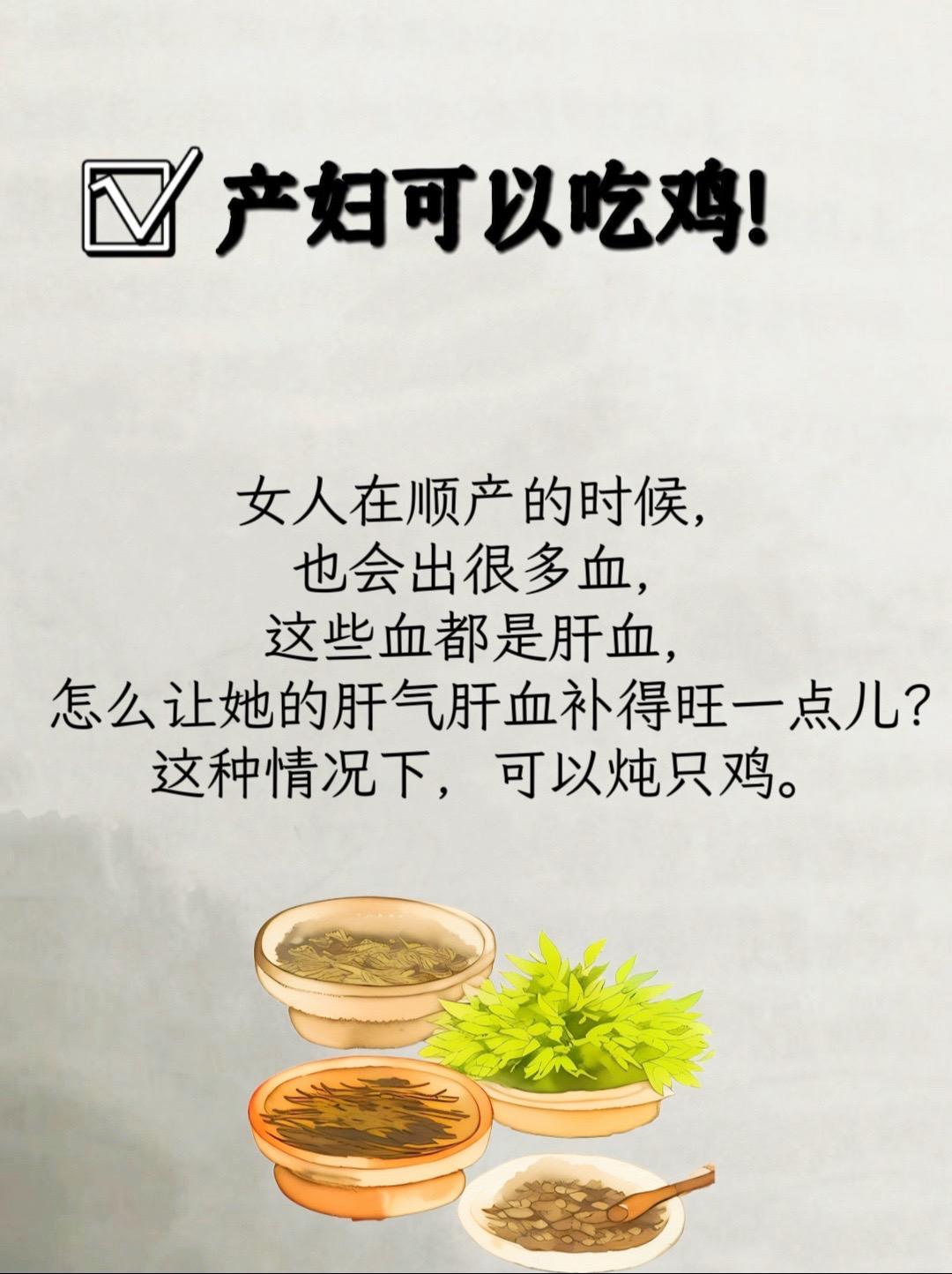 女人在顺产的时候,也会出很多血,这些血都是肝血,怎么让她的肝气肝血补得旺一点儿?这种情况下,可以炖只鸡。