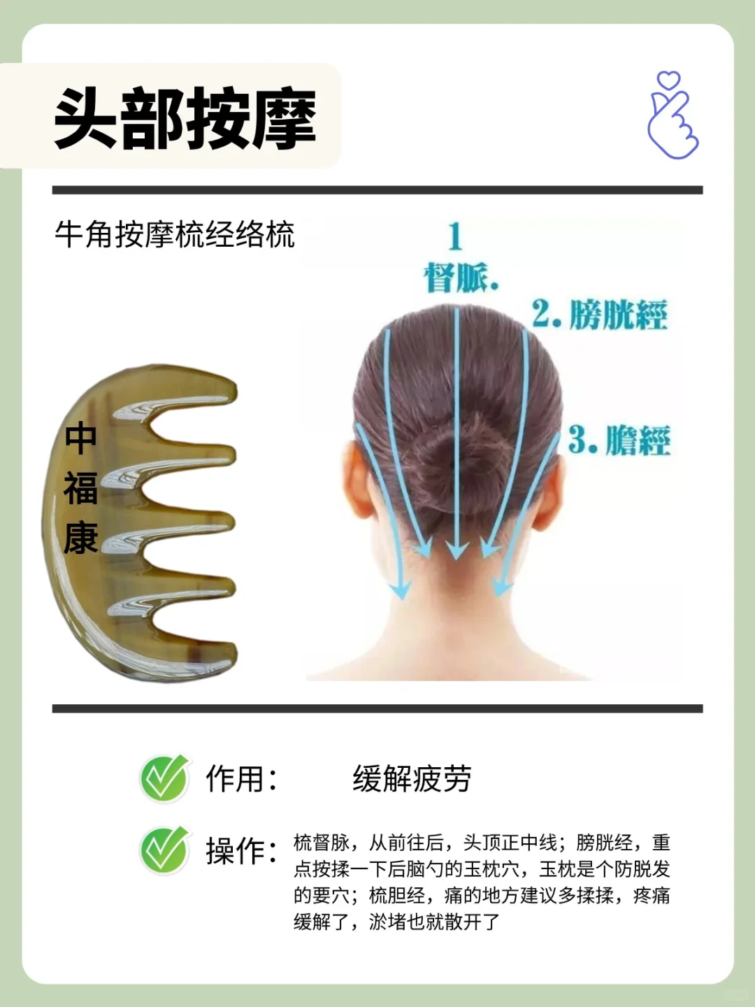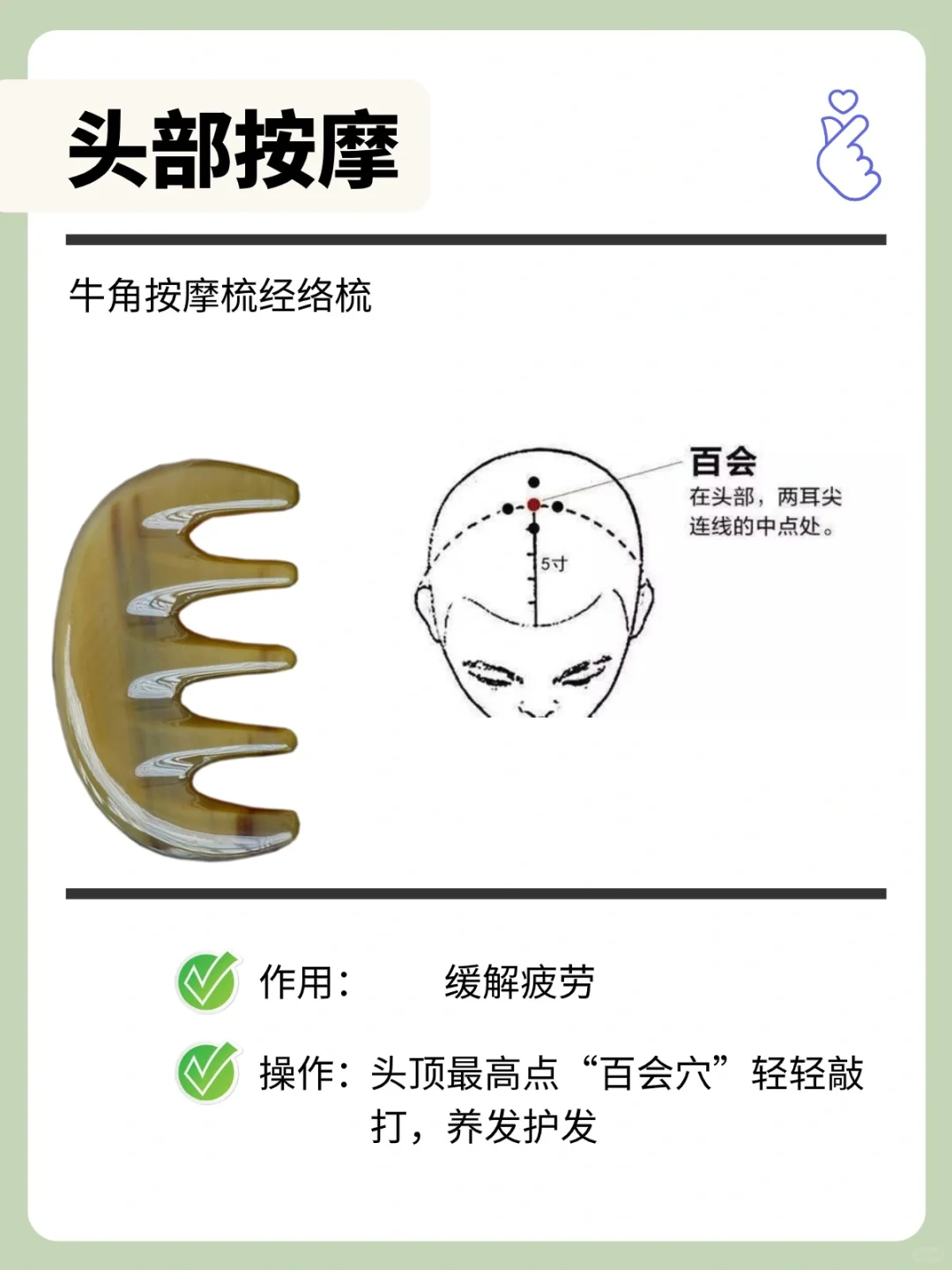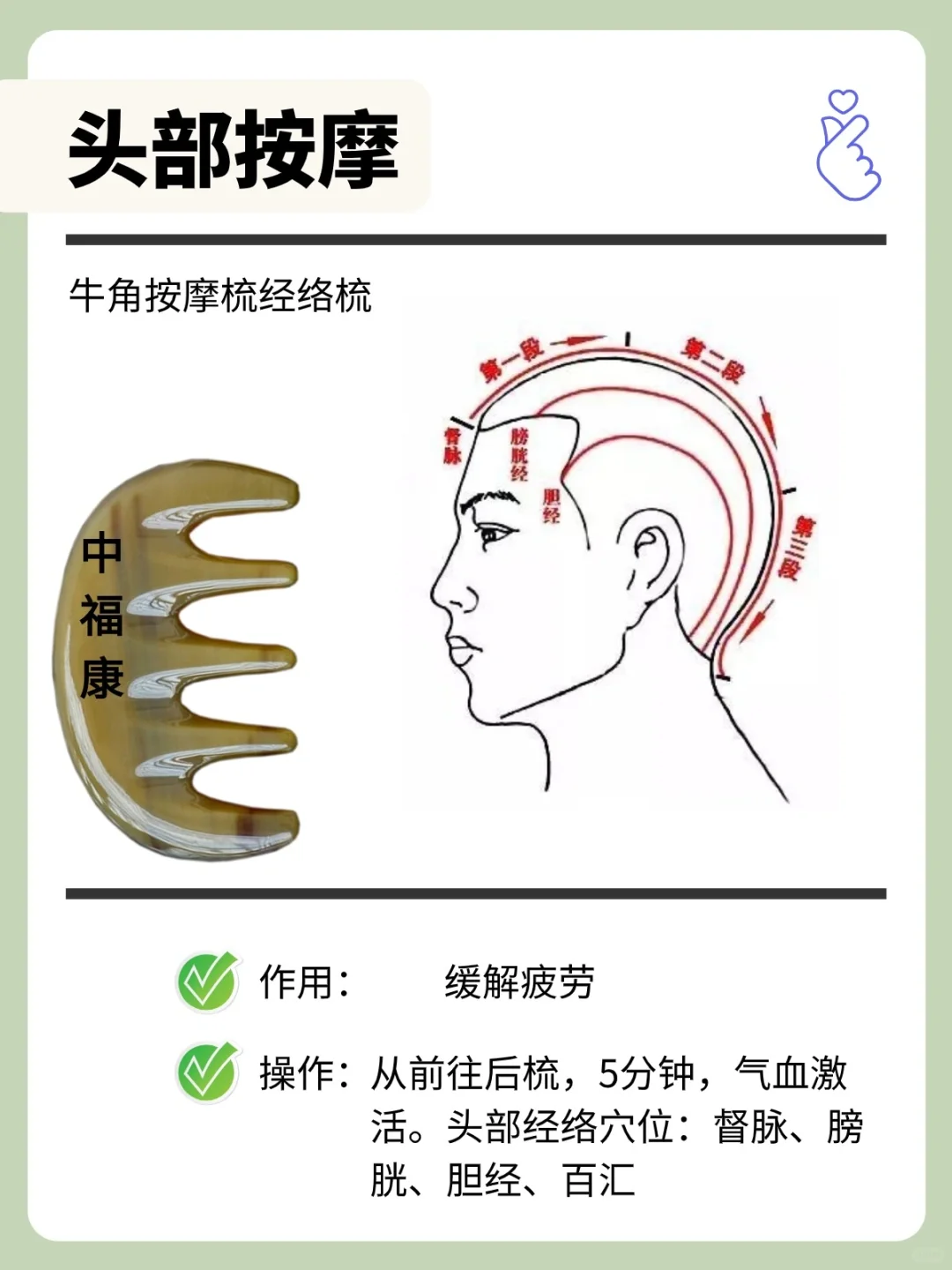 经络梳,又叫拨筋梳,按摩梳,集拨筋、按摩、刮痧、梳理于一体,同时享受多种功能。 五经经络梳子,能够更好地贴合头部曲线,减少按摩头与头皮之间的缝隙,使按摩效果更加显著。这种设计可以使头皮得到充分的放松和血液循环,同时减轻按摩器的摩擦和压力,使按摩过程更加愉悦和轻松。 - 经络梳使用方法:梳、刮、点、按 ---梳--- 发际线两寸往下的位置开始往后梳,梳到头皮的每一寸,促进循环,梳通头部经络。 相同手法,适用于颈部、手臂、手指等。 · ---刮--- 当刮痧板使用,用梳背面部轻刮,提拉紧致面部肌肤。 注意⚠️,刮拭前需先涂抹润滑油或润滑乳液,避免刮伤皮肤。 · ---点--- 经络梳梳齿可用于点按,穴位点按,拨筋按摩,足够满足日常使用需求。除了点按头部,还可点按眼周,舒缓眼周疲劳。 注意力度,灵活点按,以自己的耐受为准,不长时间点按同一部位。 · ---按--- 肩颈酸痛,用经络按摩梳按压肩颈部位,舒缓肌肤紧绷疲劳。 肩颈外,还可用于手臂和腿部等,通过梳理按压,可以促进循环,缓解肌肉压力。