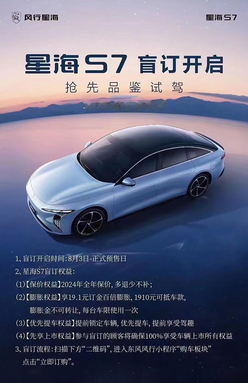 近日,东风风行官方透露,旗下全新车型——星海S7正式开启盲订。从即日起至预售日,参与盲订用户可享2024年全年保价,多退少不补、享19.1元订金百倍膨胀,1910元可抵车款、提前锁定车辆,优先提车以及参与盲订将确保100%享受车辆上市所有权益等。据悉,新车是一款纯电中型轿车,未来将会主打13万-20万的轿车市场。【来自懂车帝车友圈】