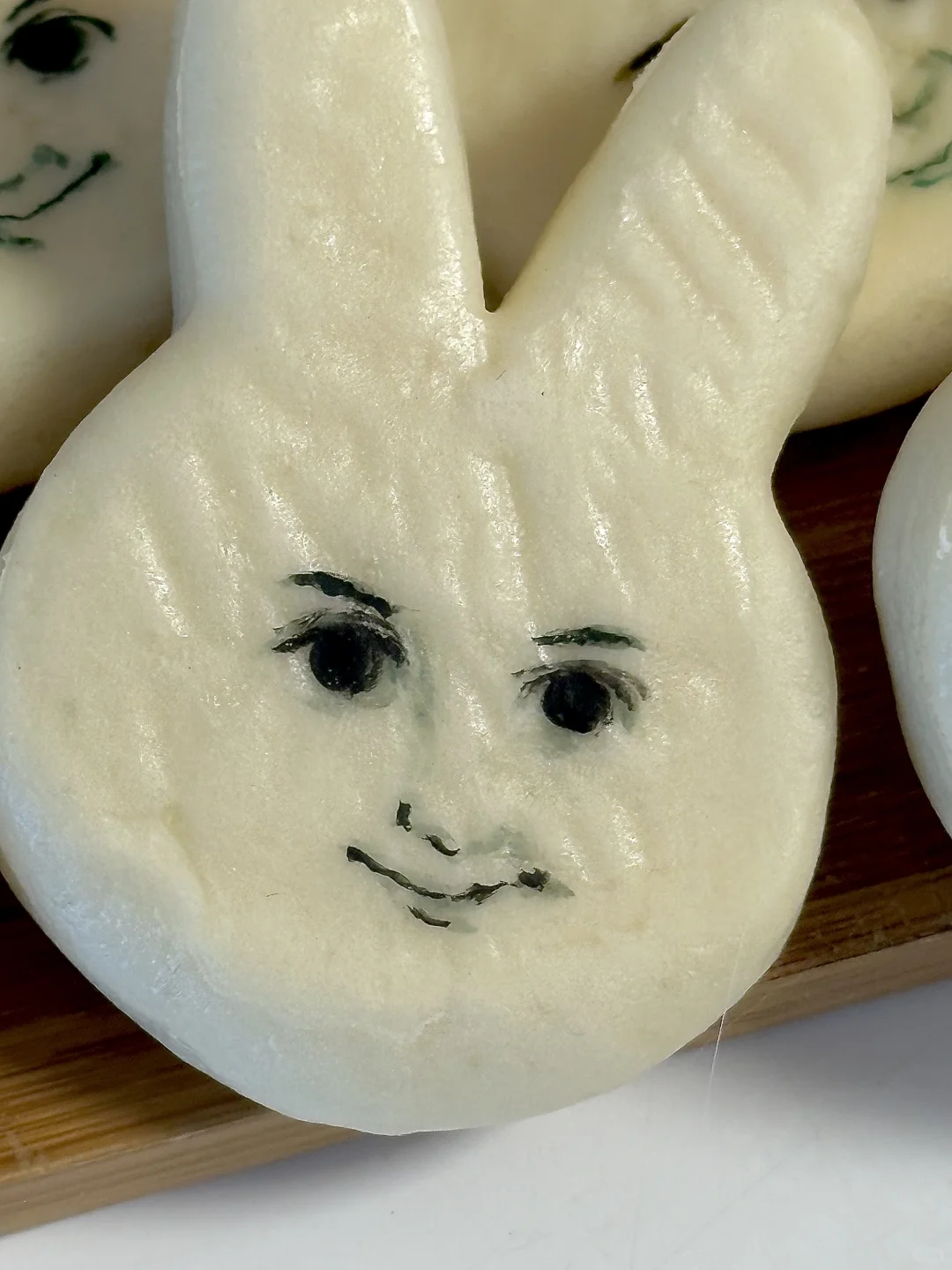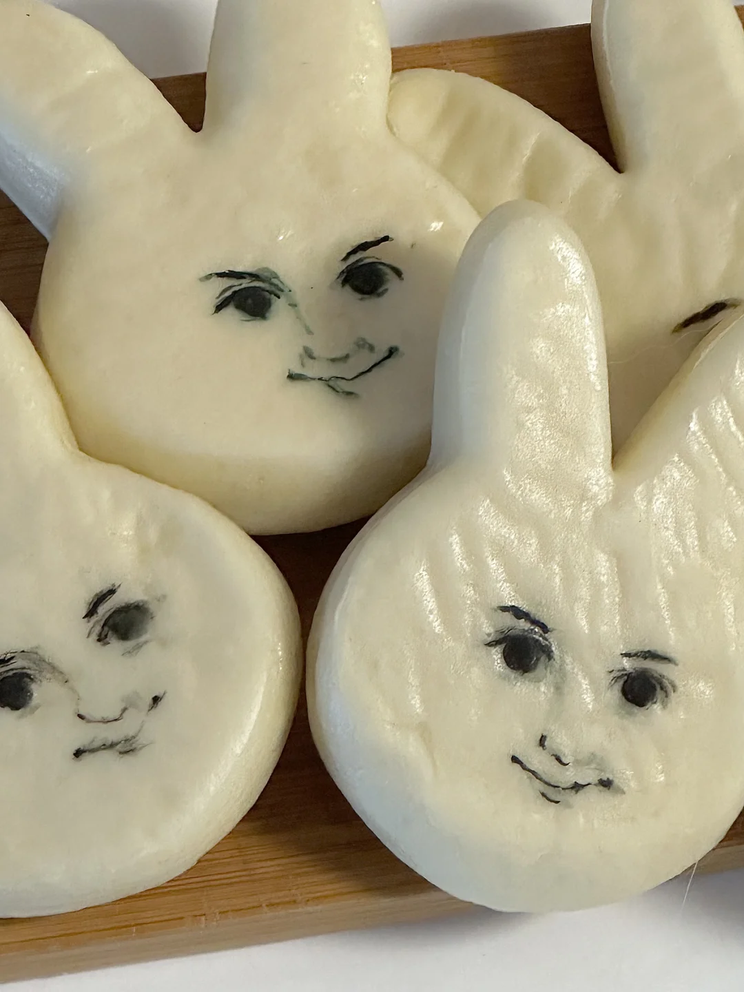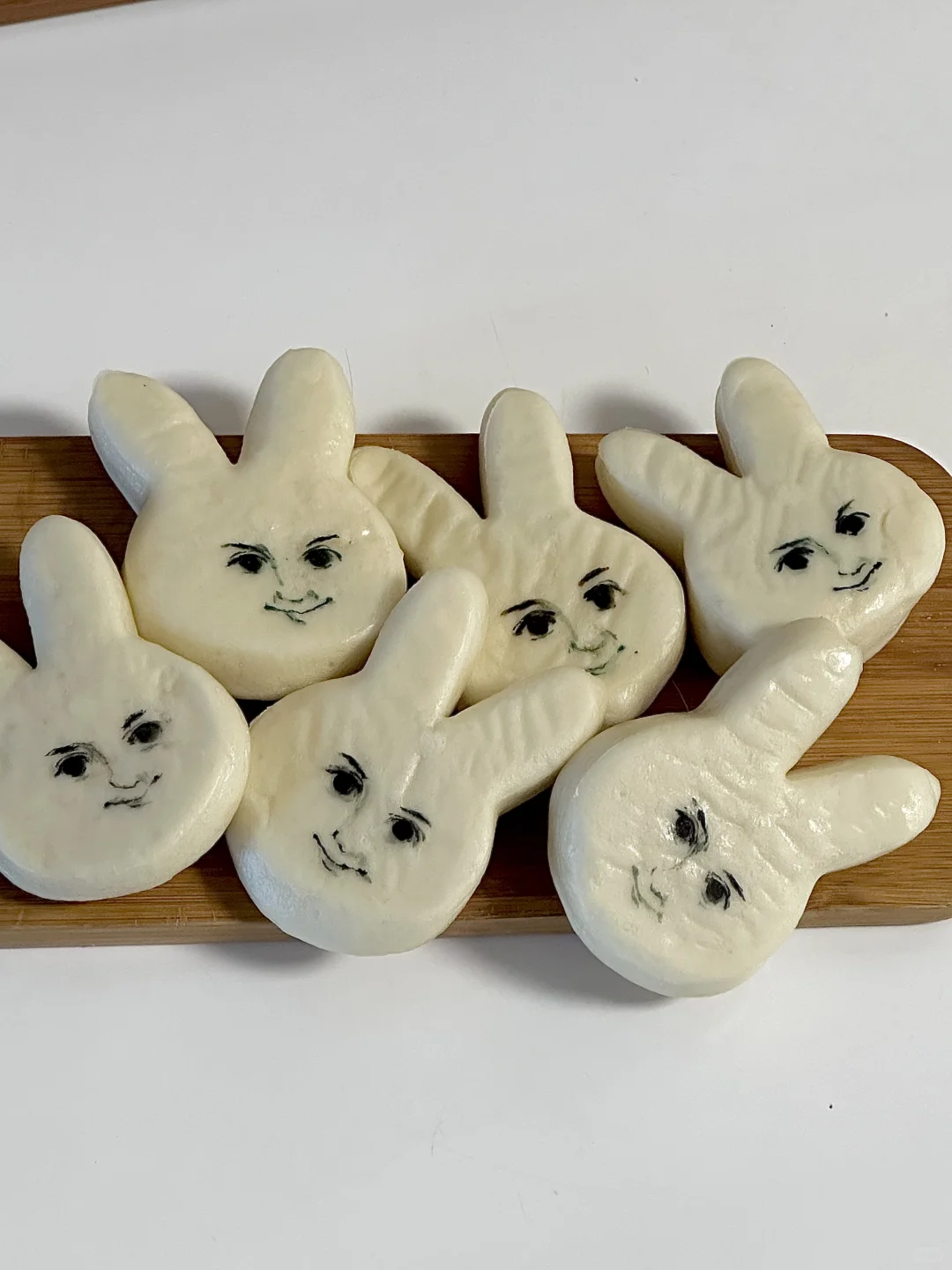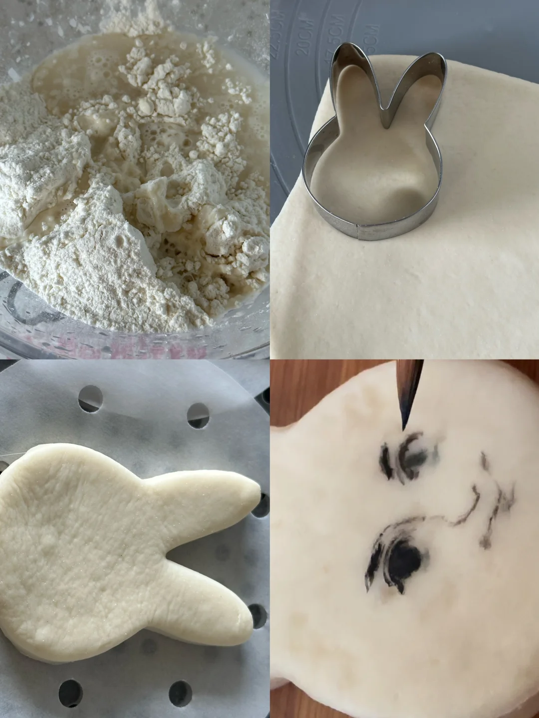 2.面团排气擀扁,用饼干模具压出兔子头(什么模具都可以,圆形也可以),发酵至1.5倍大后蒸12分钟