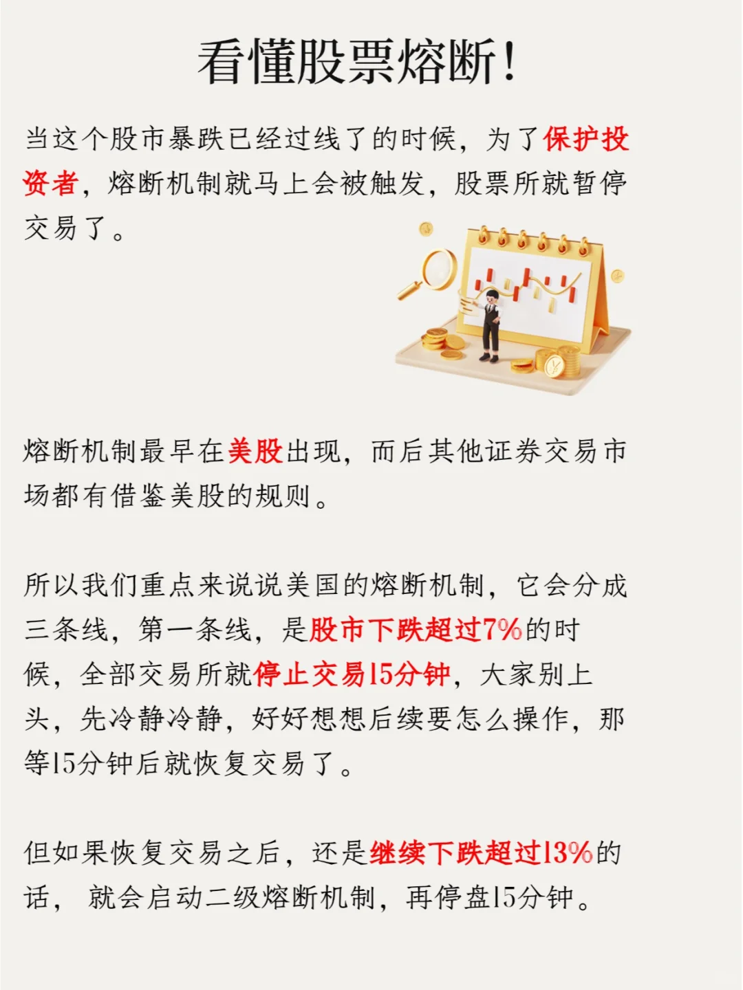 所以我们重点来说说美国的熔断机制,它会分成三条线,第一条线,是股市下跌超过7%的时候,全部交易所就停止交易15分钟,大家别上头,先冷静冷静,好好想想后续要怎么操作,那等15分钟后就恢复交易了。