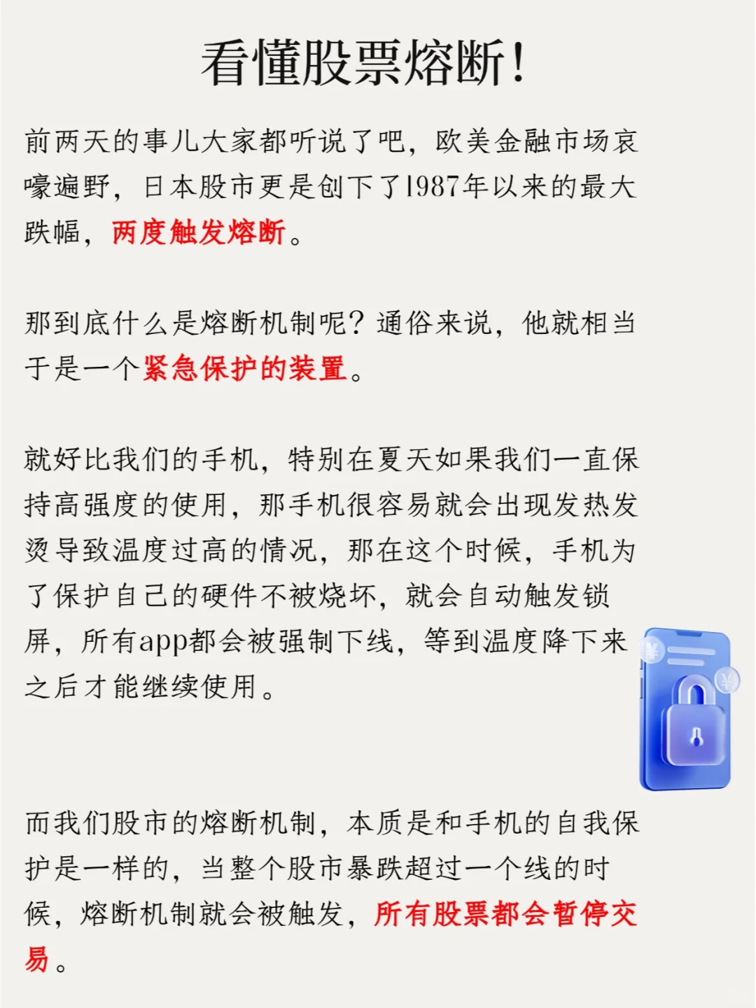 而我们股市的熔断机制,本质是和手机的自我保护是一样的,当整个股市暴跌超过一个线的时候,熔断机制就会被触发,所有股票都会暂停交易