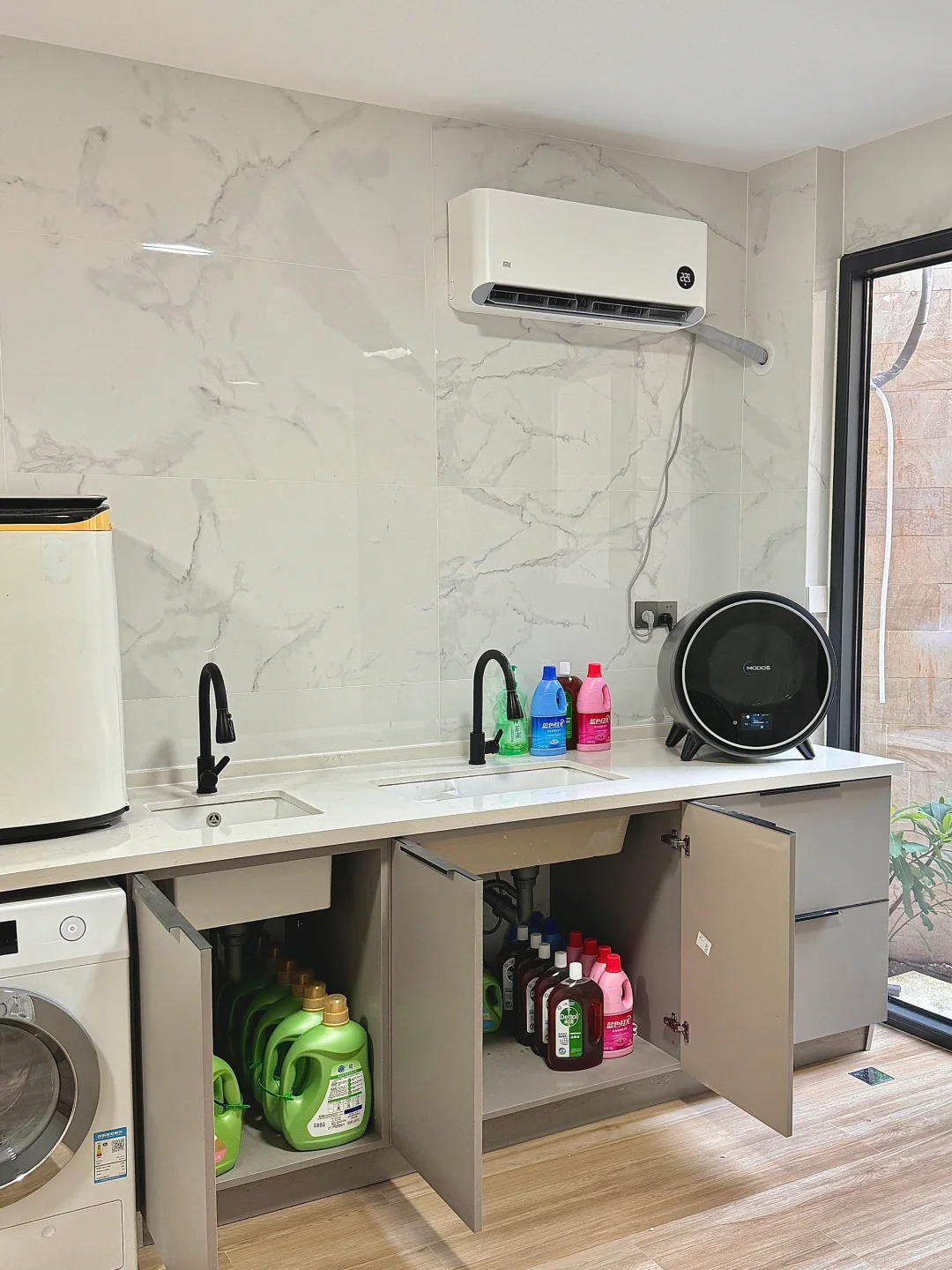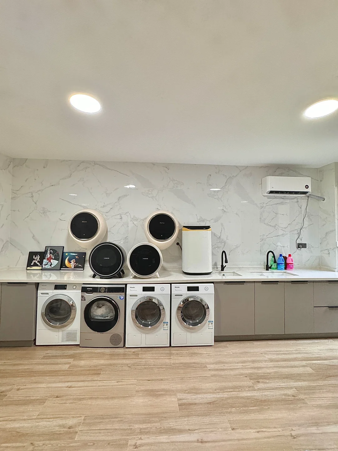 在设计新家时,为了避免晾晒衣服的麻烦和室内视觉效果的影响,所以只规划了一个独立洗衣房。这样一来,洗衣房的配置就显得尤为重要。一开始,我配置了两台洗衣机、两台烘干机,还有两台洗烘一体机,可以根据衣物的不同用途和材质,分开洗烘。