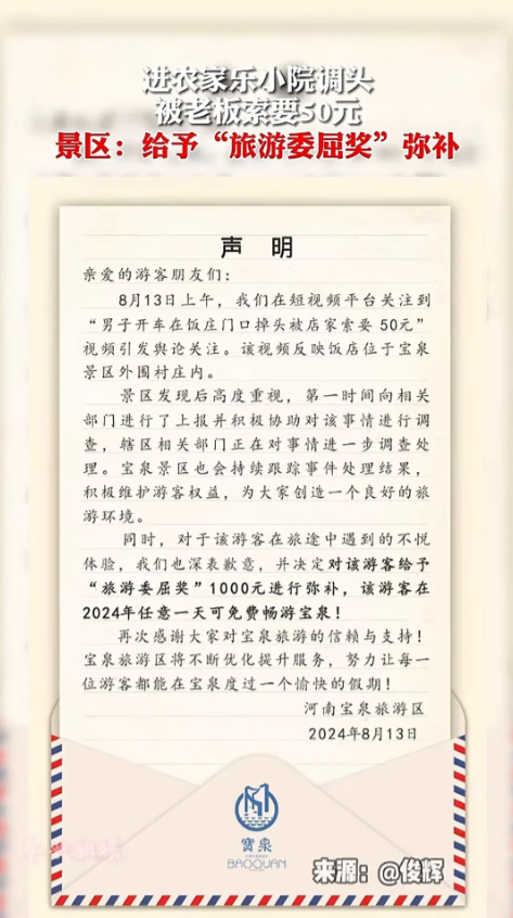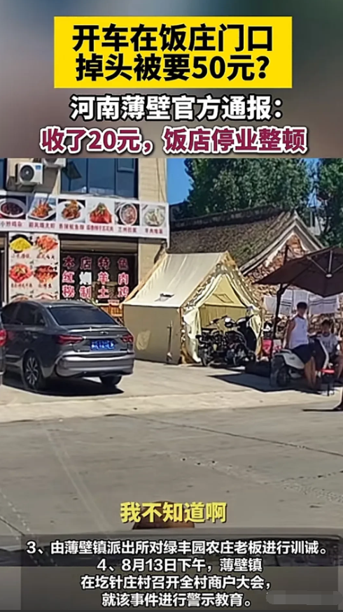 饭店掉头收50元的绿丰园农庄现状,给所有经营农家乐的老板提个醒,现在不比以往,不合理闹大就封。 事情发生在12日,一名网友在河南宝泉旅游景区附近找饭店吃饭,因为没有找到合适的就把车开入一家农家乐掉头,然后饭店老板询问得知不是吃饭,是掉头就收50元,最后车上乘客给了20元。 视频发到网上后引发热议,当地发布通报,责令饭店停业整顿。另外,宝泉旅游景区决定给游客1000元旅游委屈奖。 这件事情无论是当地,还是景区处理很及时,很敞亮。现在人人都有手机,不是几十年前,坑一个没有人知道。但凡不合理,发到网上引发热议就得不偿失。