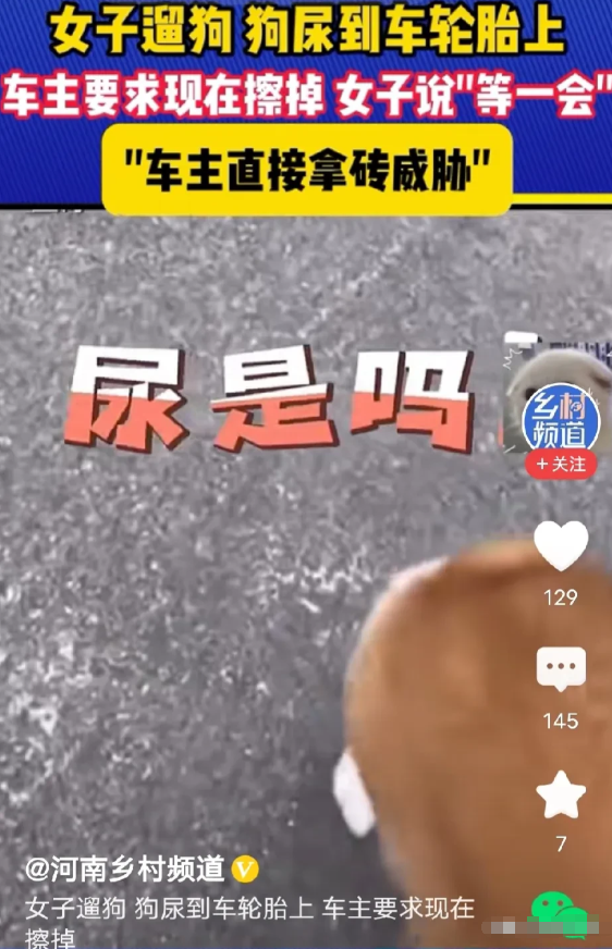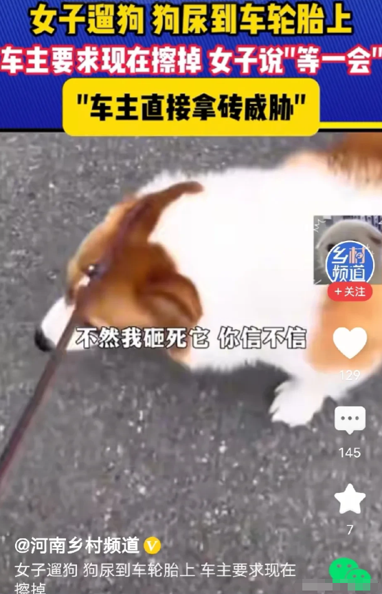 在上海发生了一件事,一位女子遛狗时没有拴绳,结果她的狗跑到一辆小轿车旁边,在轮胎上撒尿。这一幕正好被车主看见,车主很生气,要求女子立刻把轮胎擦干净。 女子显得有些不以为然:“什么啊,尿是吧,我拿什么擦?” 车主更加生气了:“我不管你用什么方法,赶紧给我擦干净!” 女子开始试图缓和局面:“我可以转账给你,或者之后用水冲洗。” 但车主坚持:“我不要钱,你必须现在就擦干净!” 女子提出:“别跟我胡搅蛮缠的,我可以给你钱!” 车主找到一块砖头,威胁说:“我不要钱,现在就擦干净!你不擦,我就砸死它!” 女子反驳:“你敢!” 随后传来一声响动,狗发出惨叫声…… 这件事的具体结局不清楚,但从整个事件来看,女子的确有错在先。首先,她遛狗没有拴绳,这种行为本身就存在安全隐患;其次,她眼睁睁地看着自己的狗在别人的车上撒尿而不制止,这种行为确实不合适。轮胎沾上狗尿后,不仅会影响其他狗的行为,还会对轮胎造成一定的损害。因此,可以说女子的行为导致了这次冲突的发生。