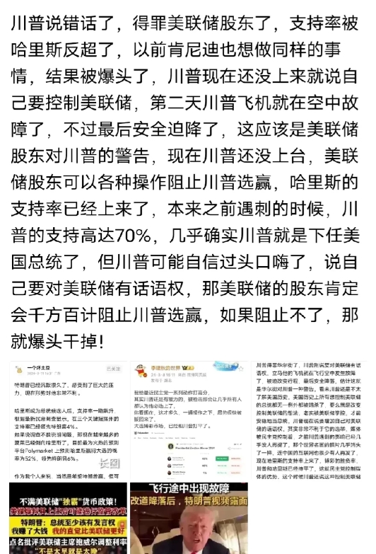 川普总统梦悬了,川普得罪美联储股东后,支持率就被哈里斯反超了,现在博彩市场哈里斯的赔率已经领先川普4%了,川普8月8日公开说自己要对美联储有话语权,然后哈里斯的支持率就开始逆转了,一步一步超过了川普,大资金源源不断地捐给哈里斯!真正控制美国的不是美国总统,而是美联储的那几个股东,历史上任何觊觎美联储控制权的总统都被暗杀了,川普也不可能例外!