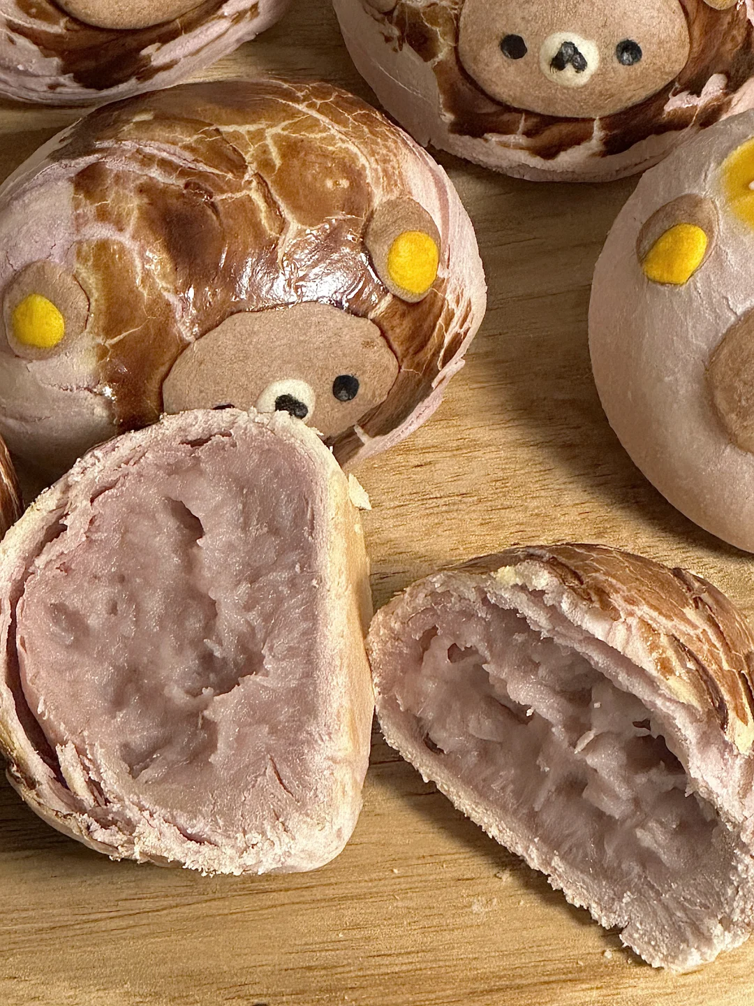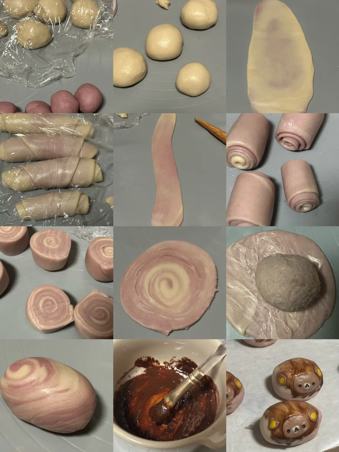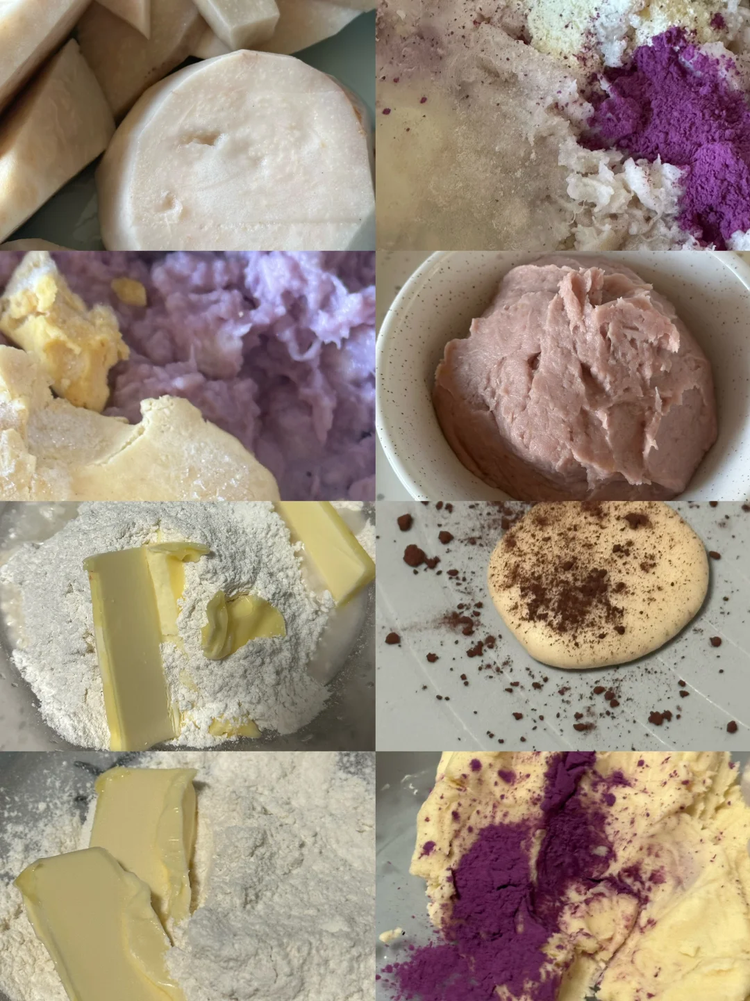 馅料:芋头、炼乳、椰子油(或黄油)、绿豆泥(我的芋头没有特别面所以我加了一点绿豆泥,可以不加)、白糖、一点点盐提味、紫薯粉