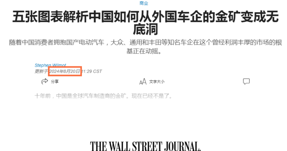 现在对中国就是如此。《华尔街日报》该文还用五张图表来解析“中国如何从外国车企的金矿变成无底洞”,极尽渲染。而在一个月前的7月10日,《华尔街日报》就发出同样的报道,唱衰中国市场。
