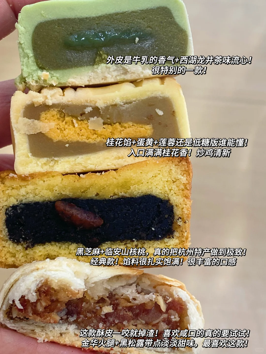 ✅到底是谁在说杭州没有美食的!上面这四个口味都好吃,但我真的很推荐金华火腿黑松露口味的。就是那种一口酥皮,酥的掉渣,入口火腿粒咸咸的,回味又带一点甜,口感真的很丰富。谁能懂!(我内心的top1,不接受反驳)而且U1说1知味观你家礼盒包装也太漂亮啦。还画上了西湖、三潭印月断桥啥的,拿到手我都舍不得吃!真的超国风的,中秋拿去送人也是倍有面~