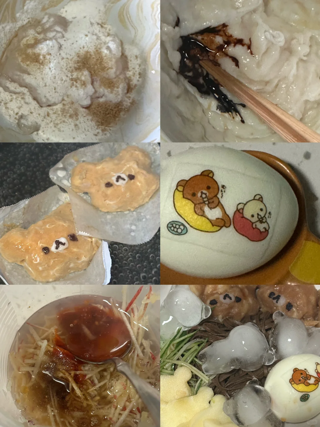 1.鱼丸配料混合均匀搅打上劲,分份调色,可可粉调色的部分放入裱花袋挤表情,做出轻松熊,水开下锅小火煮熟