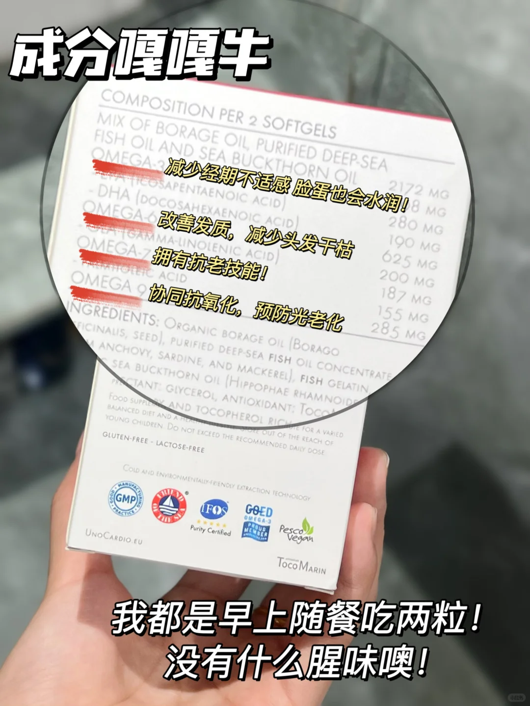 谁懂自媒体打工人t经体质的苦啊 熬夜加班各种高强度工作 饮食作息都不规律 让本来那几天肚子难受得不行的我愈发严重😭 从同事那吃到的安利,说这个WHC小仙女鱼油针对经期嘎嘎好使 我立马入手了两三盒 吃了大半年之后 真的巨🐂波一 那几天不会有明显不适 脸色暗沉都减少了许多 整个人的状态都up了 - 小仙女鱼油成分真的很nice 4种精选Omega营养矩阵 1⃣498mg-Omega-3 95%高纯度 减少经期不适感 “好朋友”来的那几天身体巴适很多 脸蛋子也蛮水润的 2⃣625mg- Omega-6 提取自欧洲琉璃苣 可以改善发质、减少头发干枯,对发质差的女孩纸太友好喽 3⃣187mg-Omega-7 沙棘果油中提取,是针对抗氧化非常有效的成分 如果抗老需求大的姐妹真可以冲 4⃣285mg-Omega-9 协同抗氧化、预防光老化 Omega3中的EPA成分对调节睡眠和情绪也很有帮助滴 那几天不会再翻来覆去睡不着、情绪暴躁 这玩意对女性真的真的太“友”好啦!! - 小仙女鱼油的原料选自智利秘鲁的深海无污染小鱼内, 成分嘎嘎安全 我都是早上随餐吃两粒,入口没有什么腥味 还是独立包装很方便 办公室宝宝出差旅行随时随地都能带上 跟我一样经期不适、肤色暗沉、睡眠质量不佳体质的姐妹都去安排上!! 尊的嘎嘎好使🉑