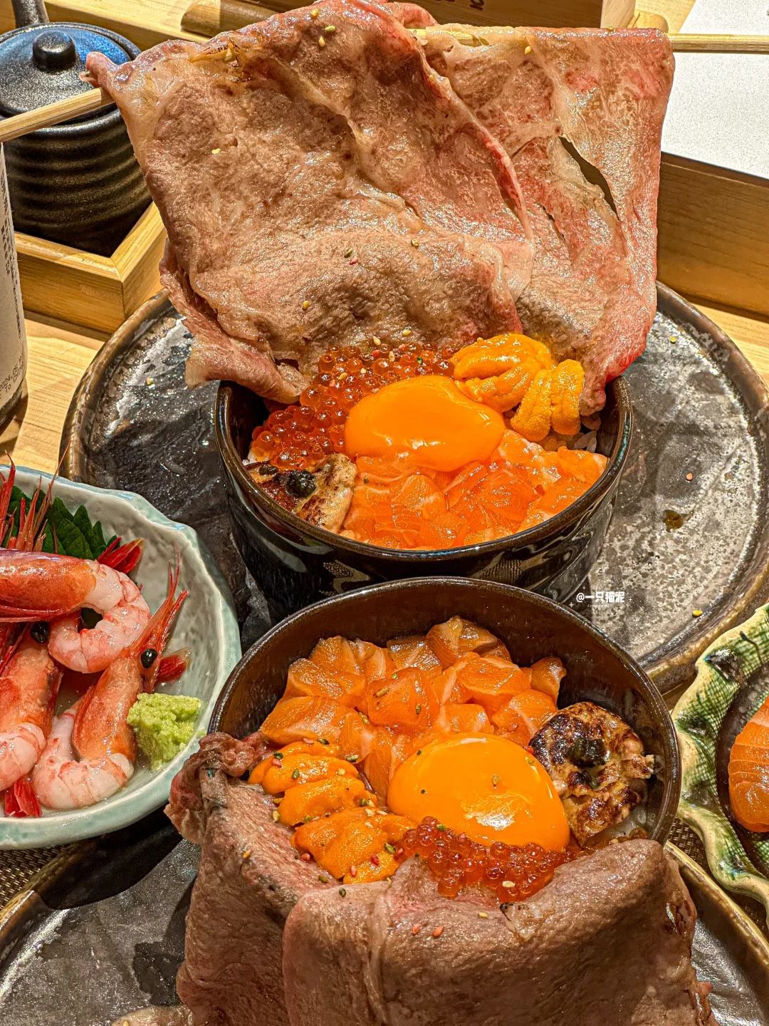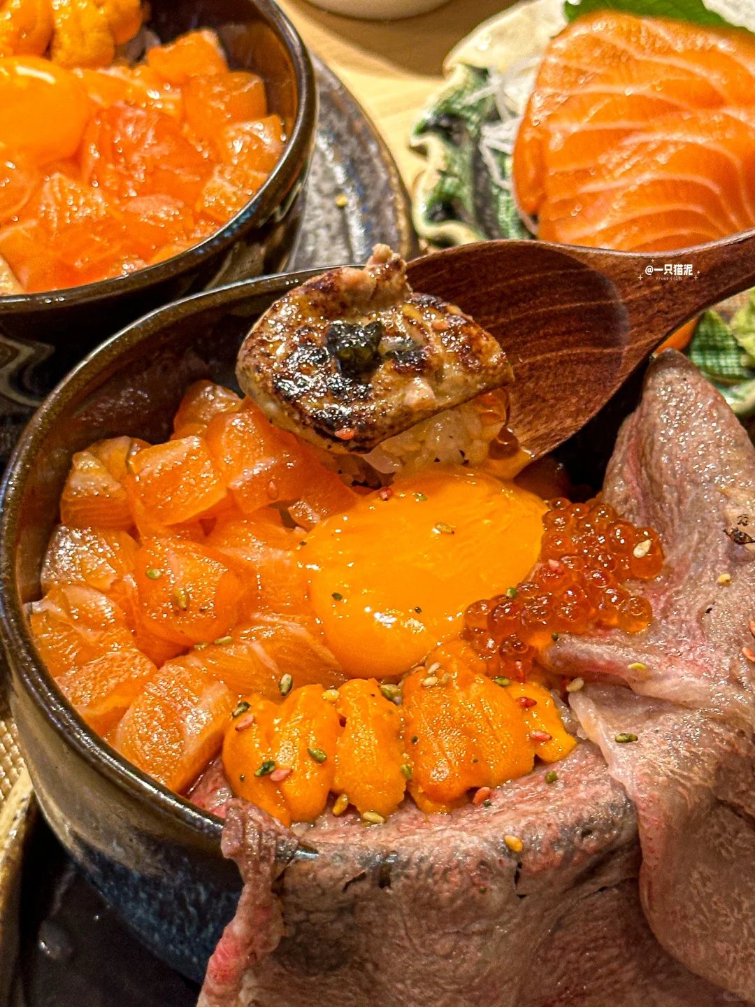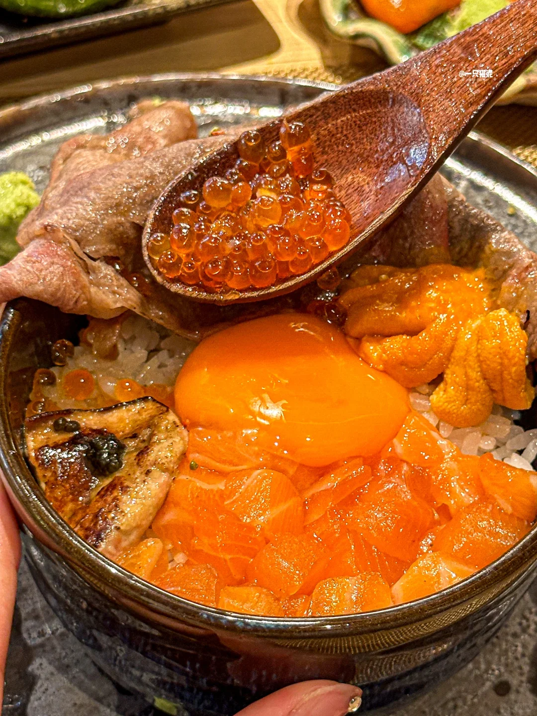 瀑布流心和牛饭,大片和牛很juicy🥩,温泉蛋拌饭好软糯🍳,三文鱼和海胆搭配鹅肝🍣,口感层次巨丰富!