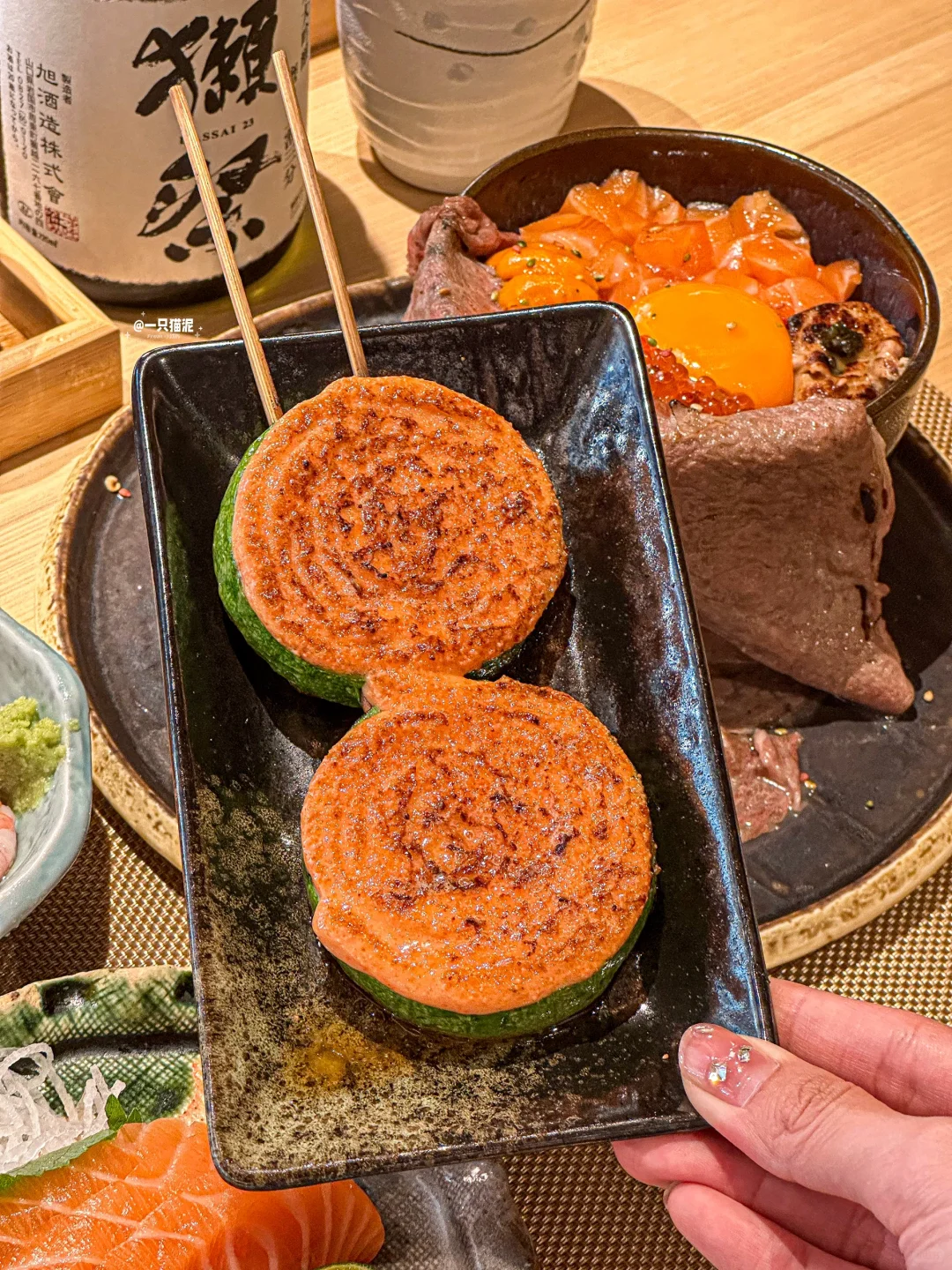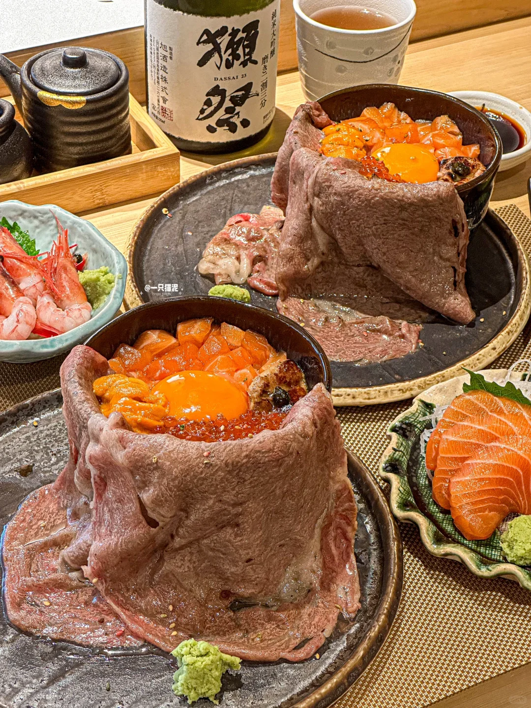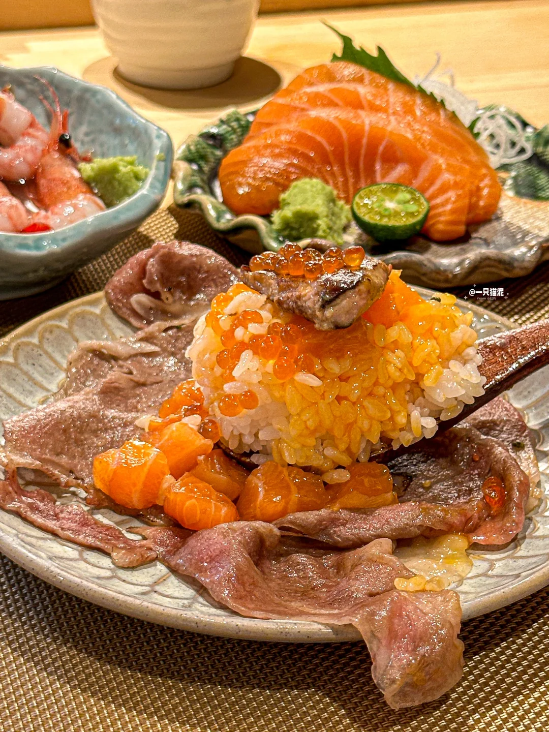 瀑布流心和牛饭,大片和牛很juicy🥩,温泉蛋拌饭好软糯🍳,三文鱼和海胆搭配鹅肝🍣,口感层次巨丰富!