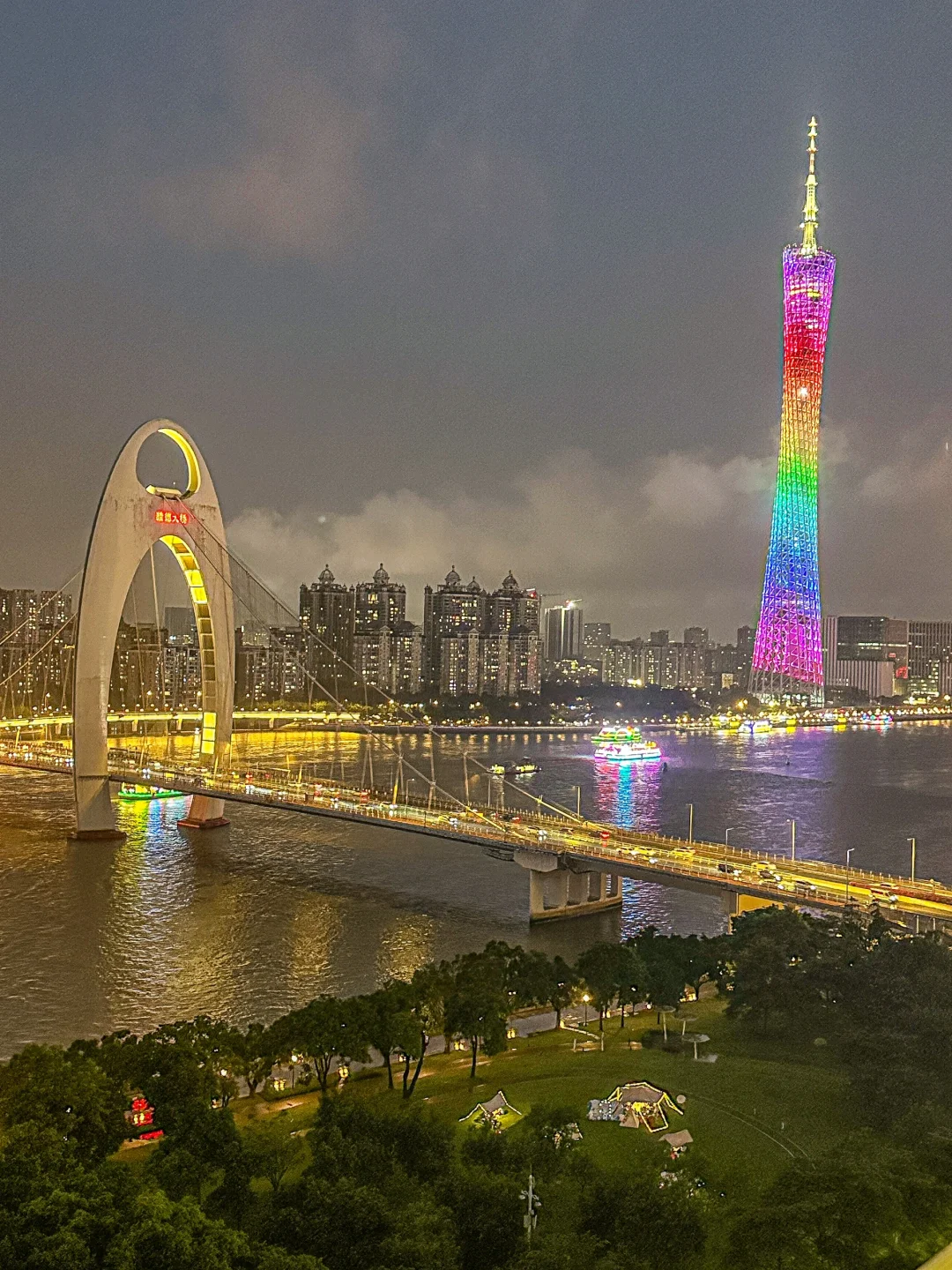 隐藏在猎德居民楼里的江景与美食,在18楼的高度,一边享用晚餐,一边被180度的无敌江景拥抱~河流闪烁,城市灯火阑珊,可以捕捉猎德大桥和广州塔同框机位!🌃