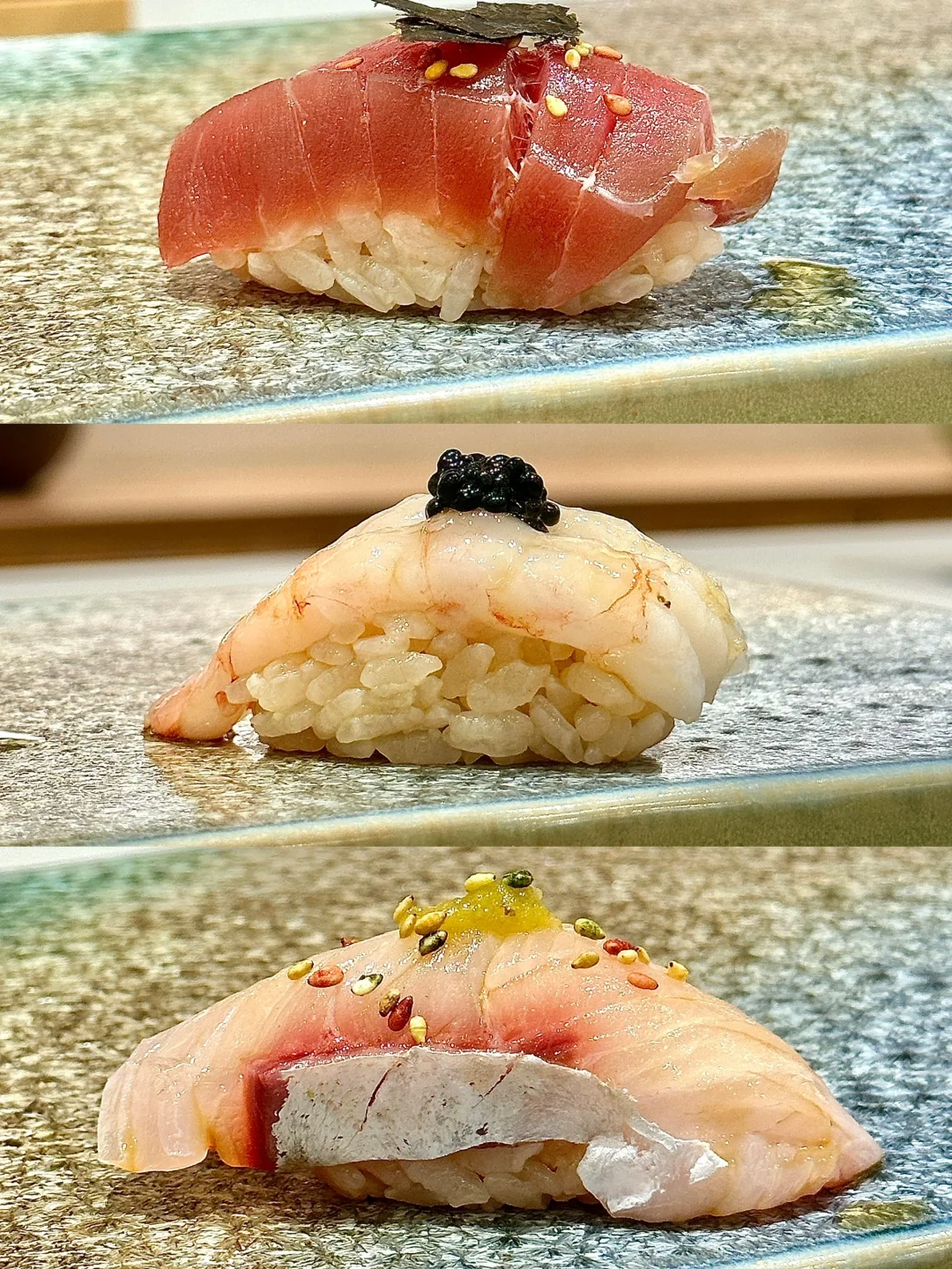 星鳗、蓝鳍金枪鱼、甜虾...这些平时舍不得点的高级货,师傅亲手捏制,每一件都是艺术品,搭配寿司姜🫚片一起吃真的很绝!🌟吃之前记得拍照留念哦!📷✨