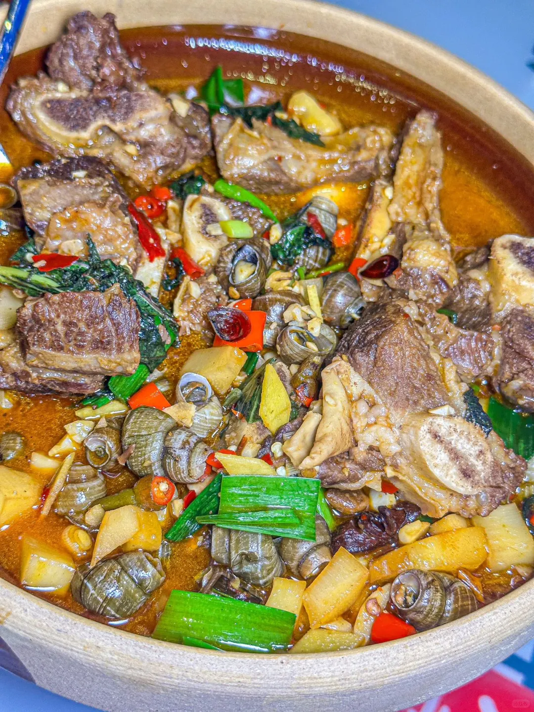 首推他们家的螺蛳牛排煲!🥩🐌 牛排软烂入味,里面还有酸笋和螺蛳,简直太费饭了!😋