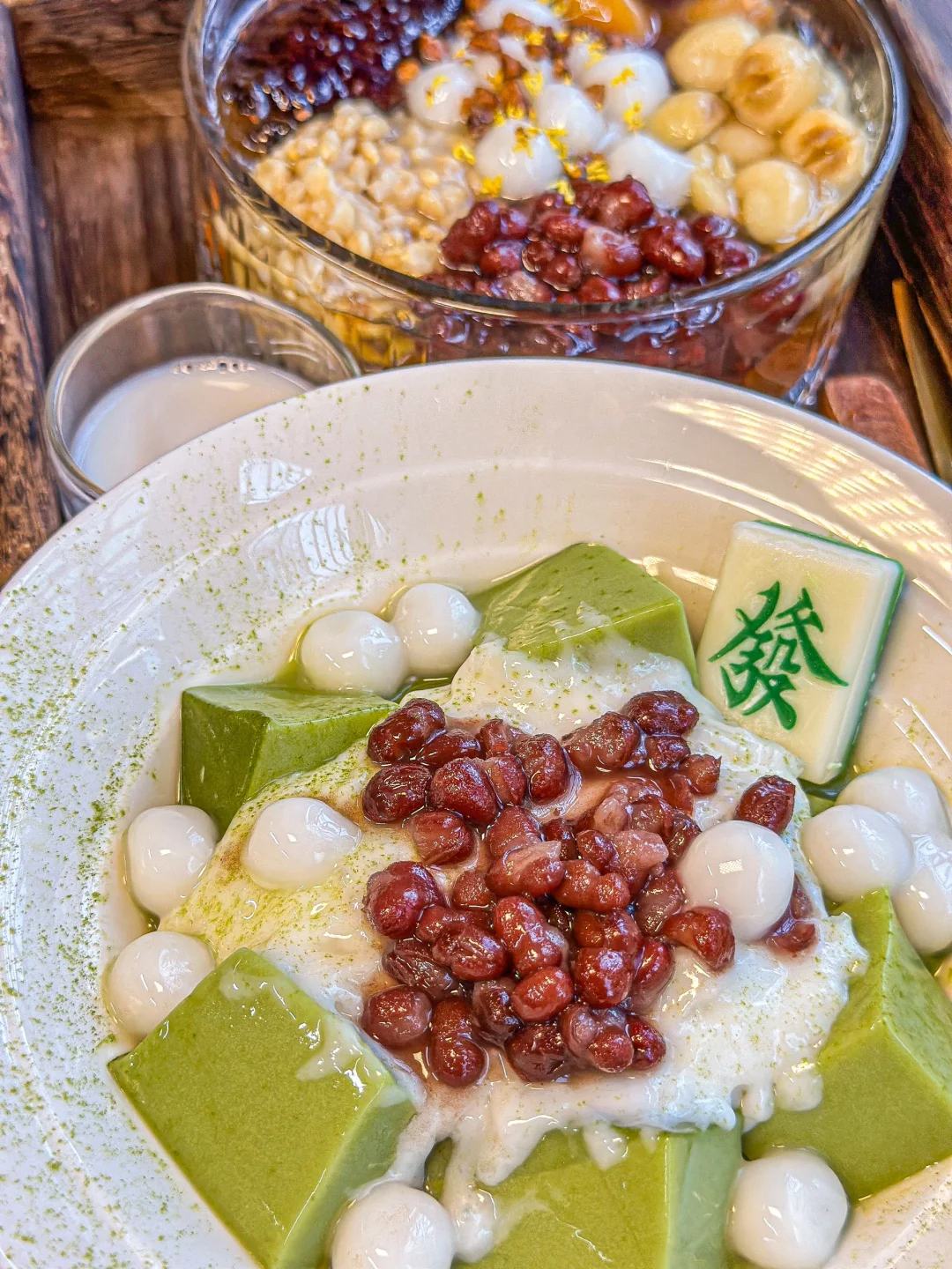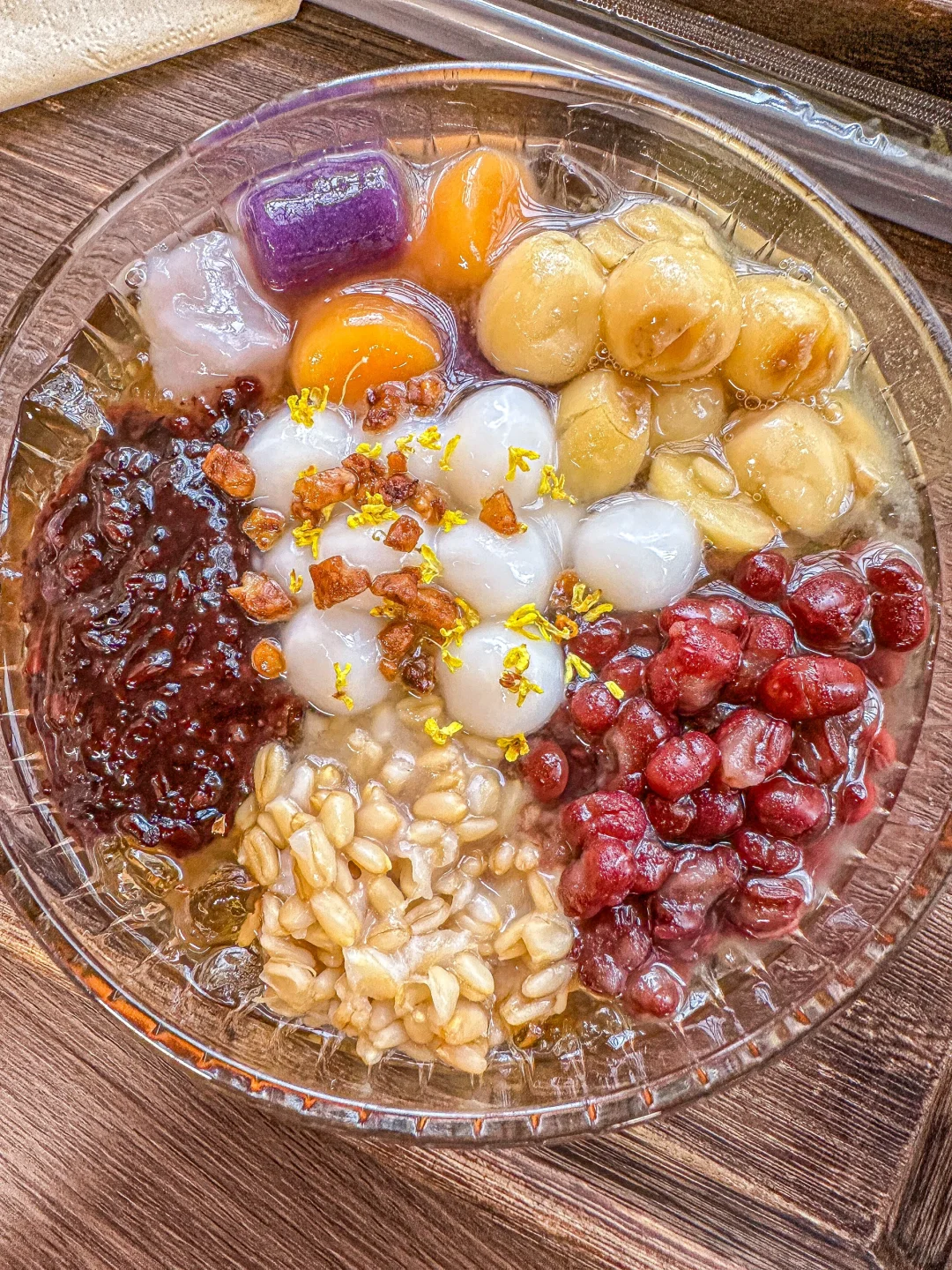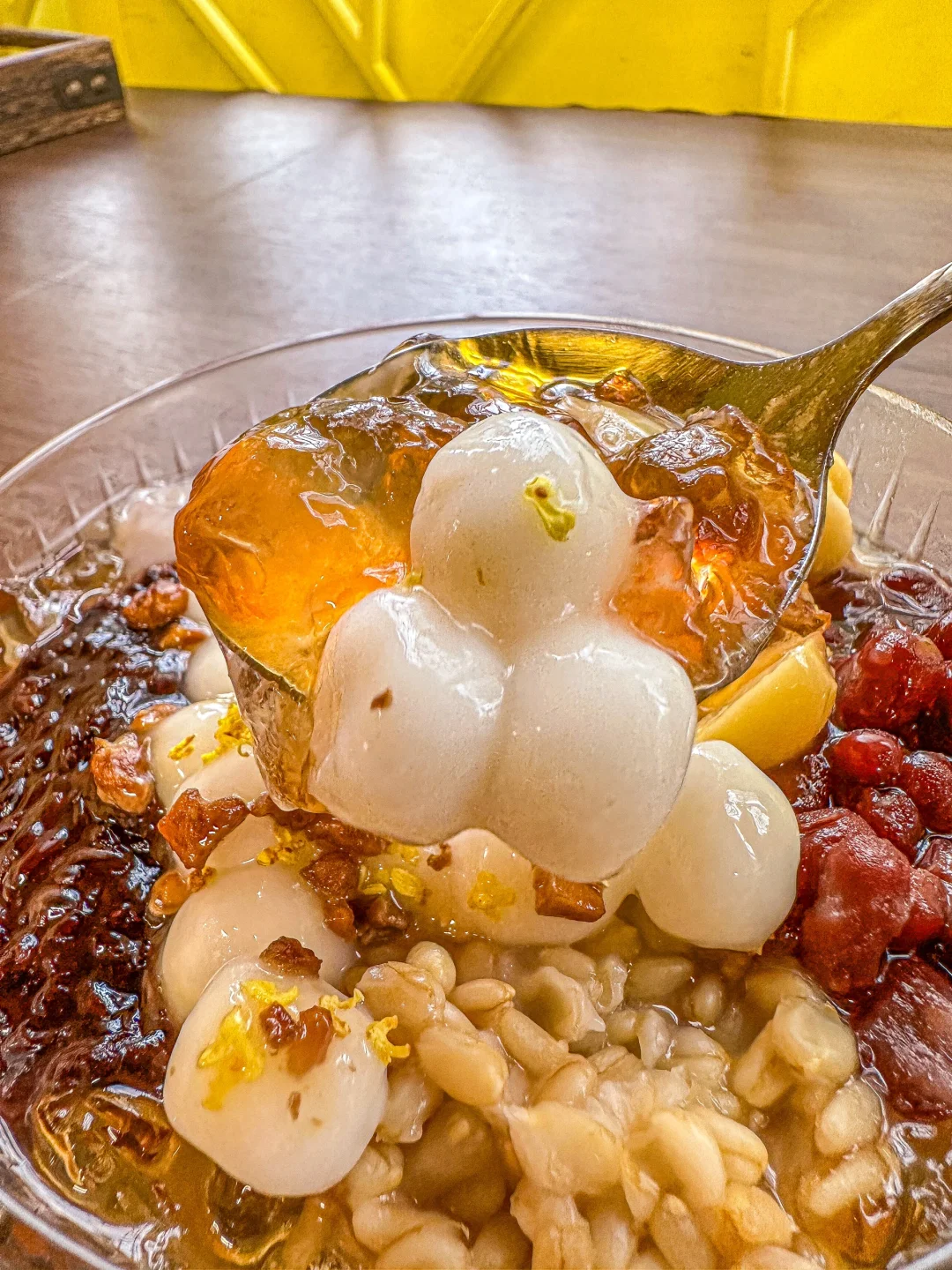金玉满堂大满贯是店里的招牌,底层满是爽滑的桃胶,上层则堆满了血糯米、莲子、燕麦、芋圆、红豆、罗汉果和菊花冻等丰富食材。
