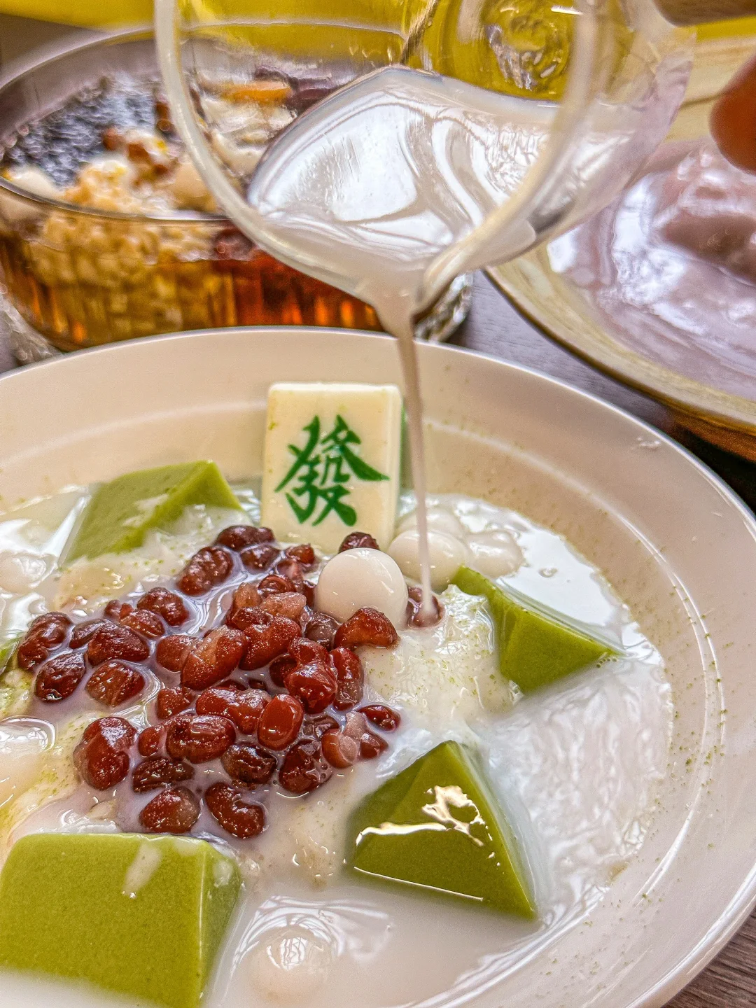 🍨另一家备受追捧的糖水铺为吉手打米麻薯抹茶奶冻。这款奶冻香气扑鼻,茶香浓郁,搭配上糯叭叭的麻薯,搭配麻将「發」財寓意著發大財!