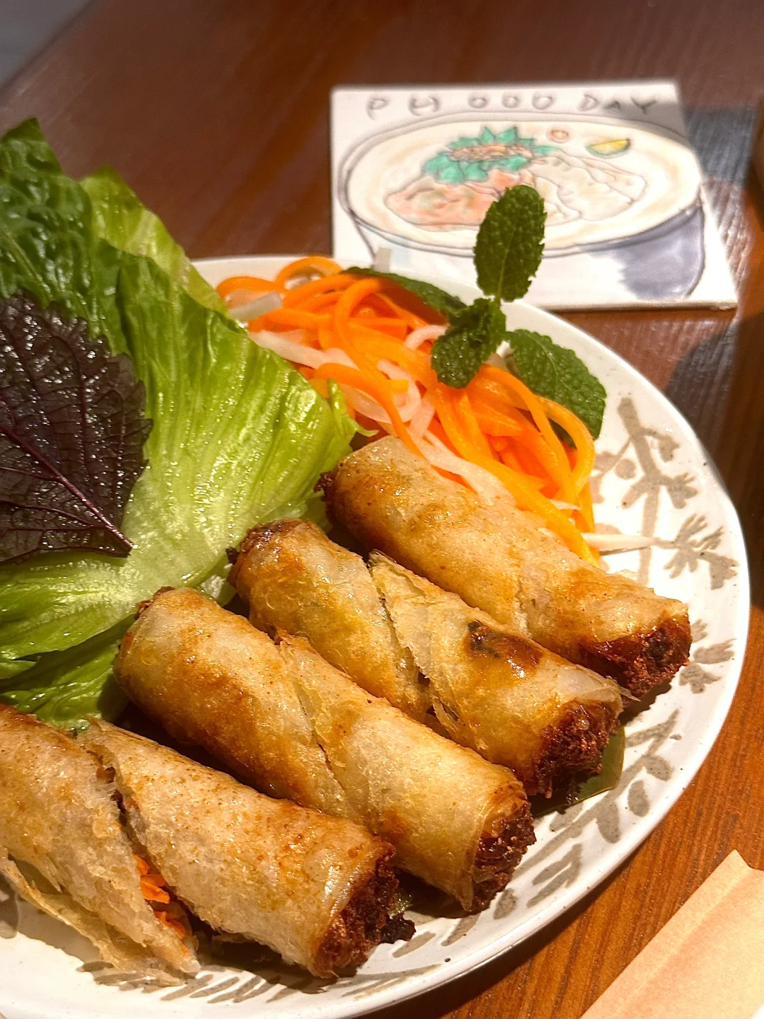 外皮炸得金黄酥脆,咔嚓咔嚓的,内馅是细腻的肉沫加上脆生生的木耳和新鲜蔬菜🥗,蘸上一点甜辣酱 Chili Sauce,酸甜交织的滋味直击灵魂!