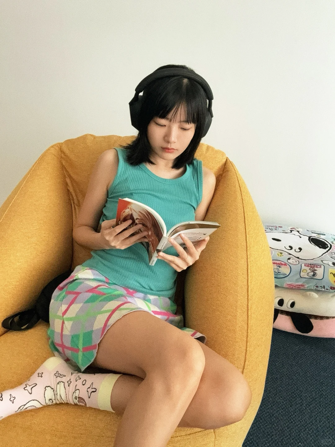 手机支架➕醒图 衣服尽量选择高饱和度的 用相机杂志耳机做道具 滤镜:涩谷日记 根据画面加点颗粒和饱和度 适当拉低光感