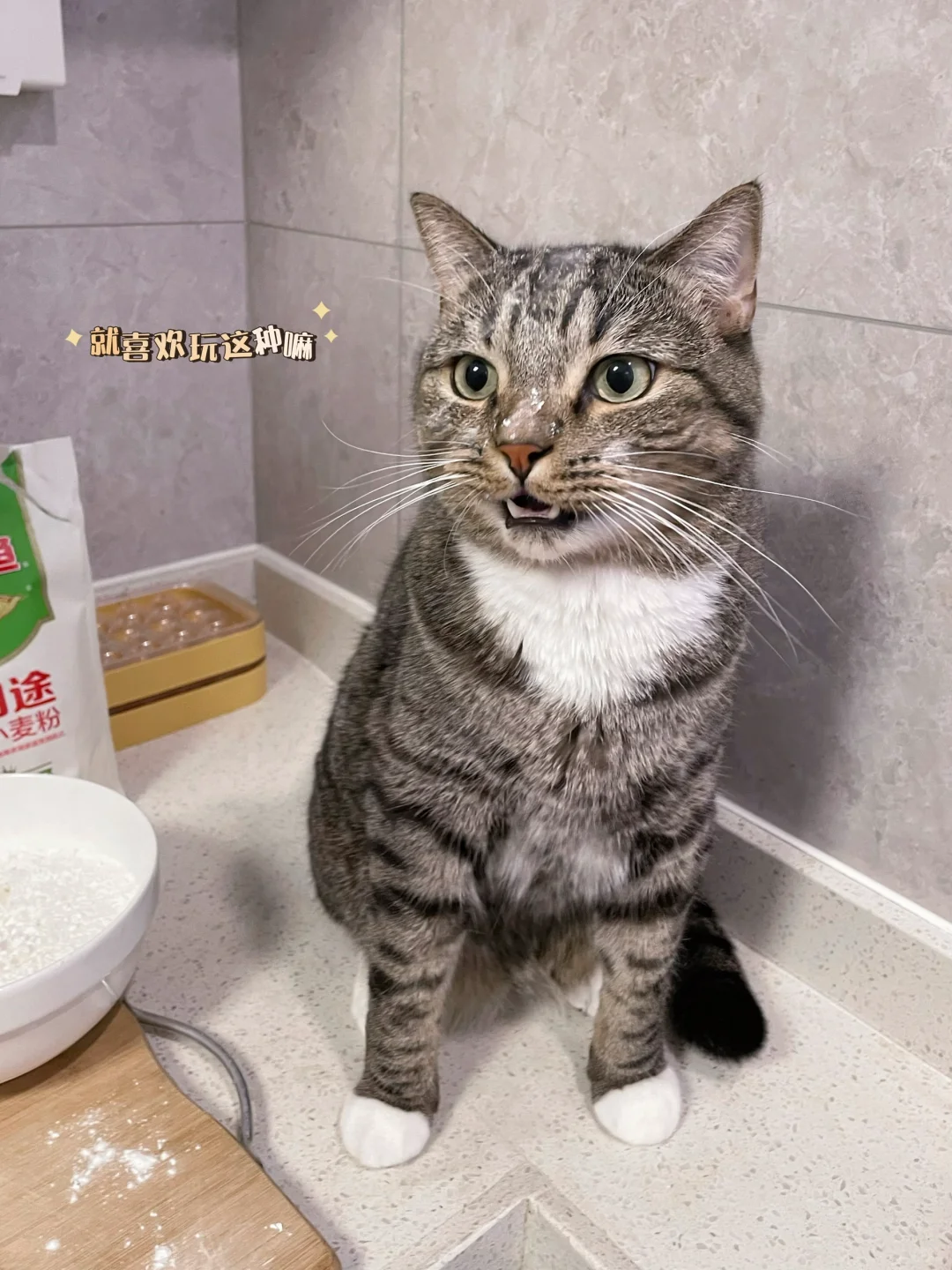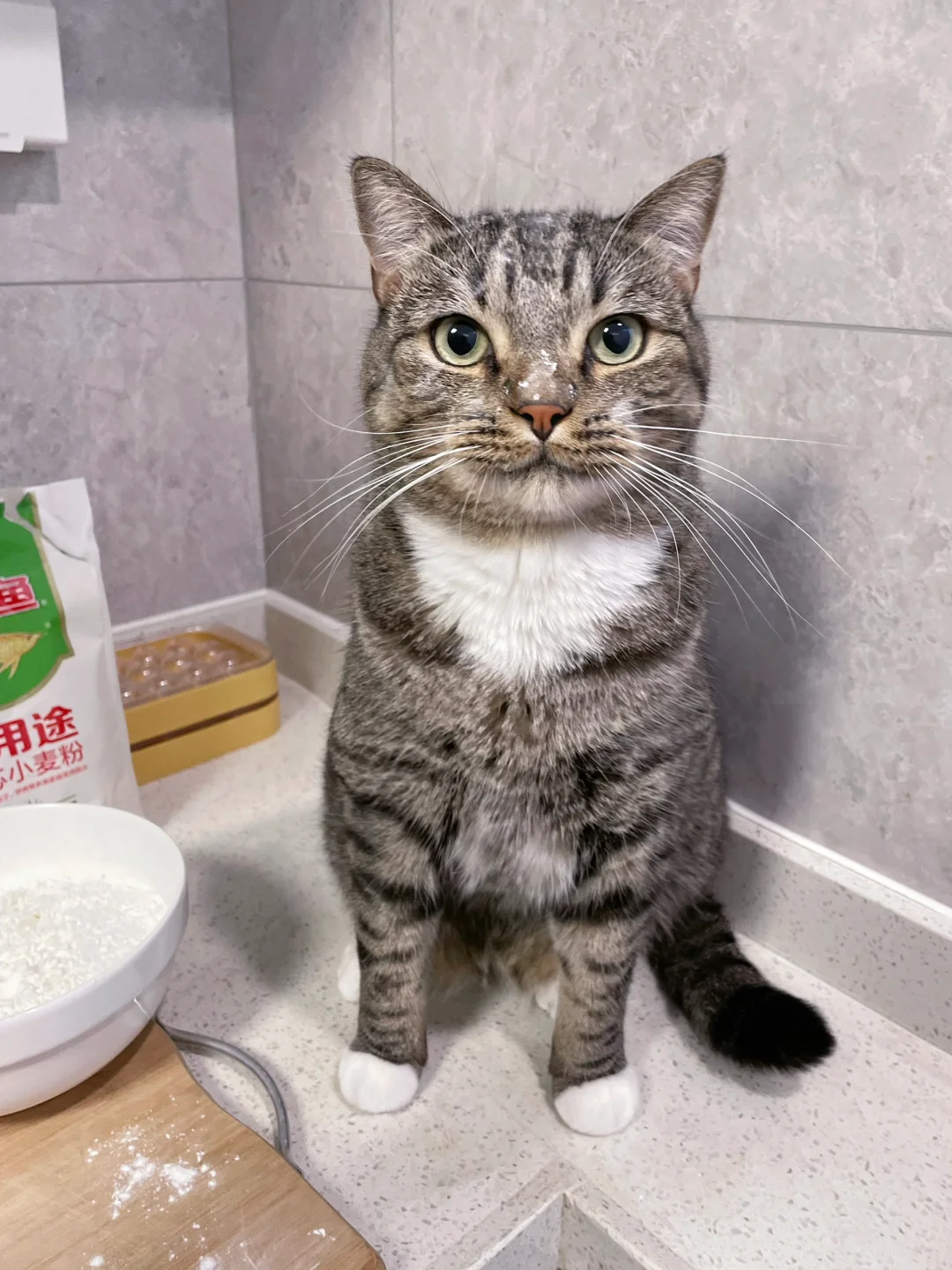 想质问它为啥突然这么捣蛋,环顾家中才发现原来猫砂告急了,它好像想把面粉当成猫砂😨