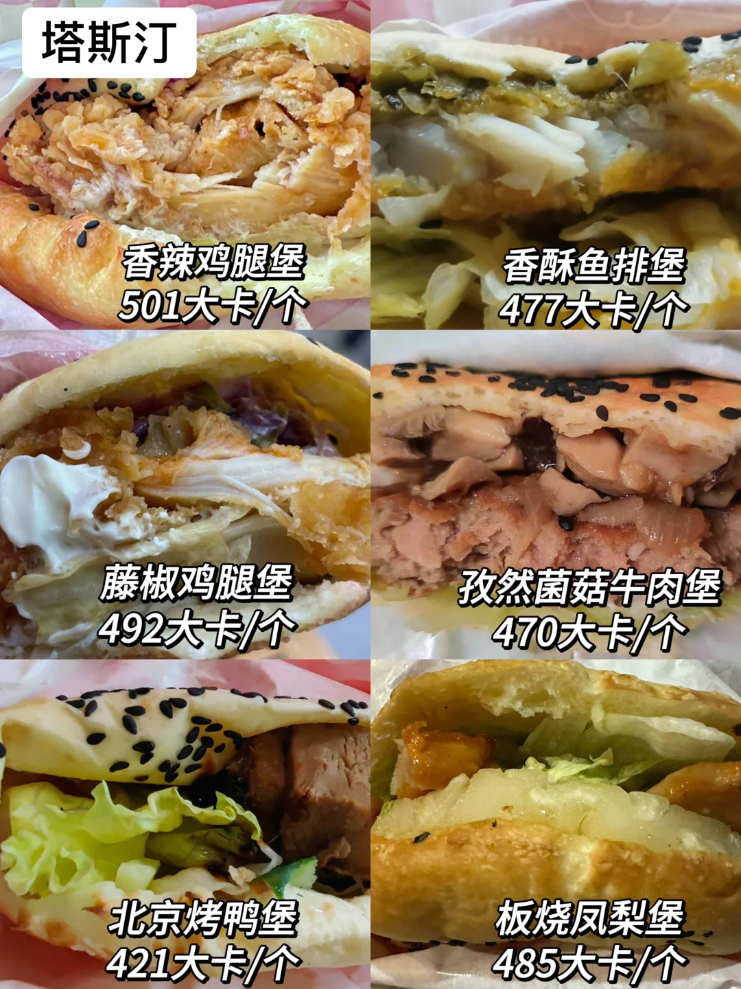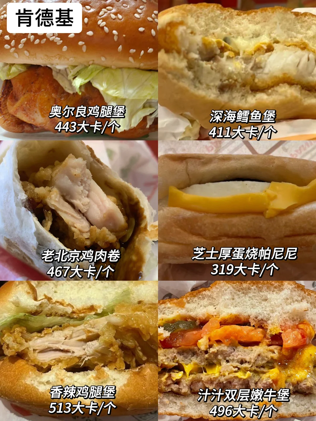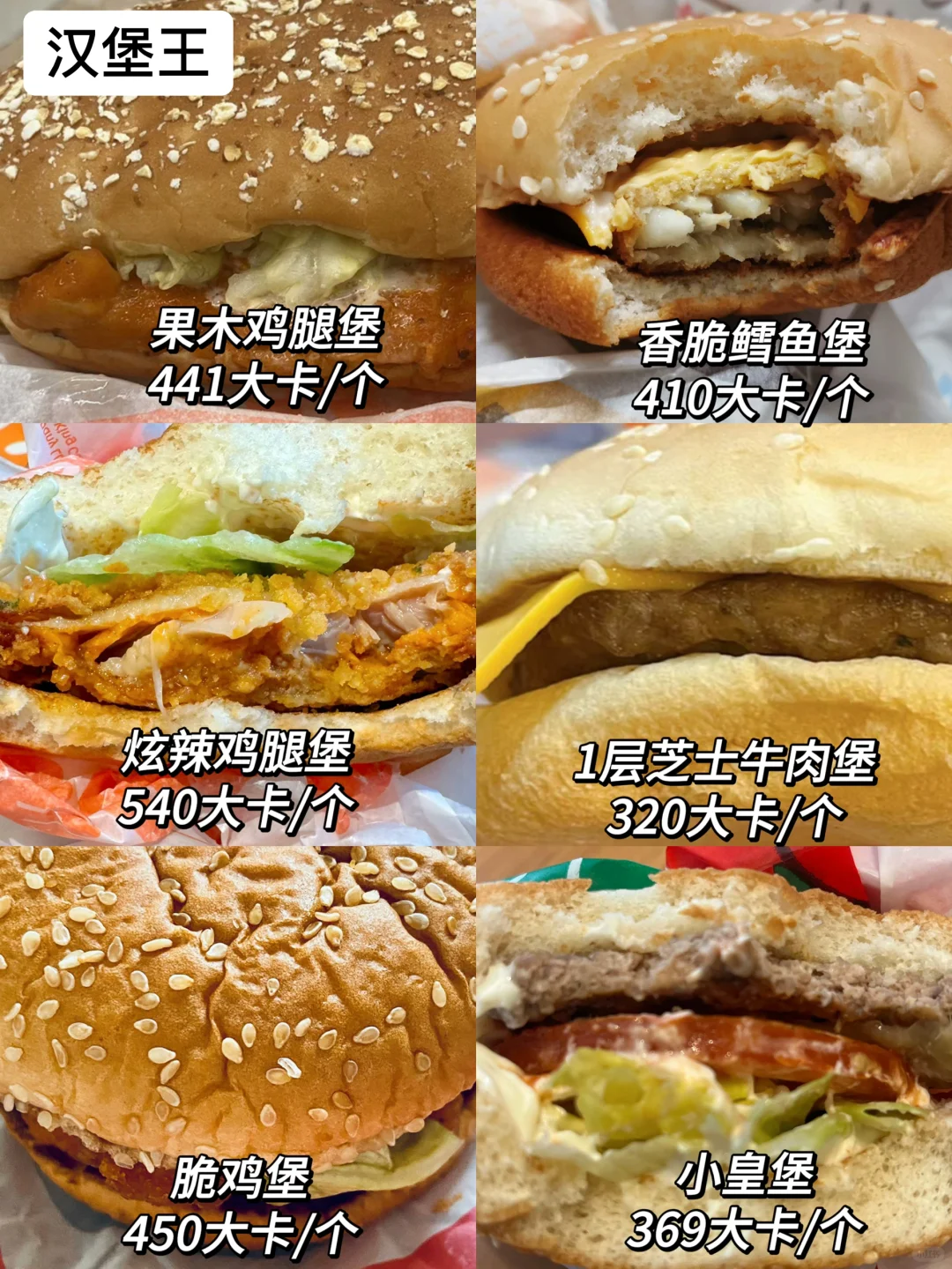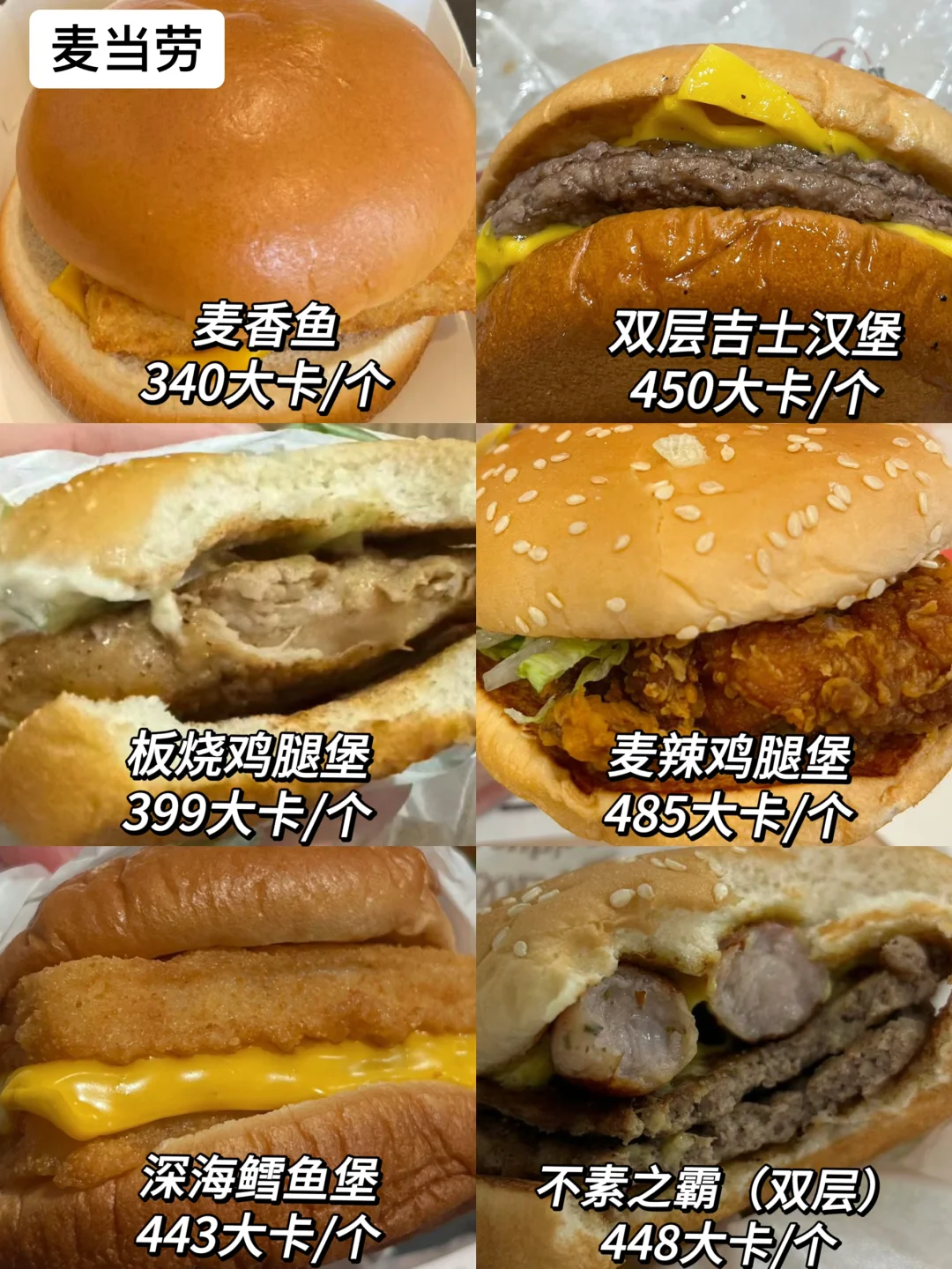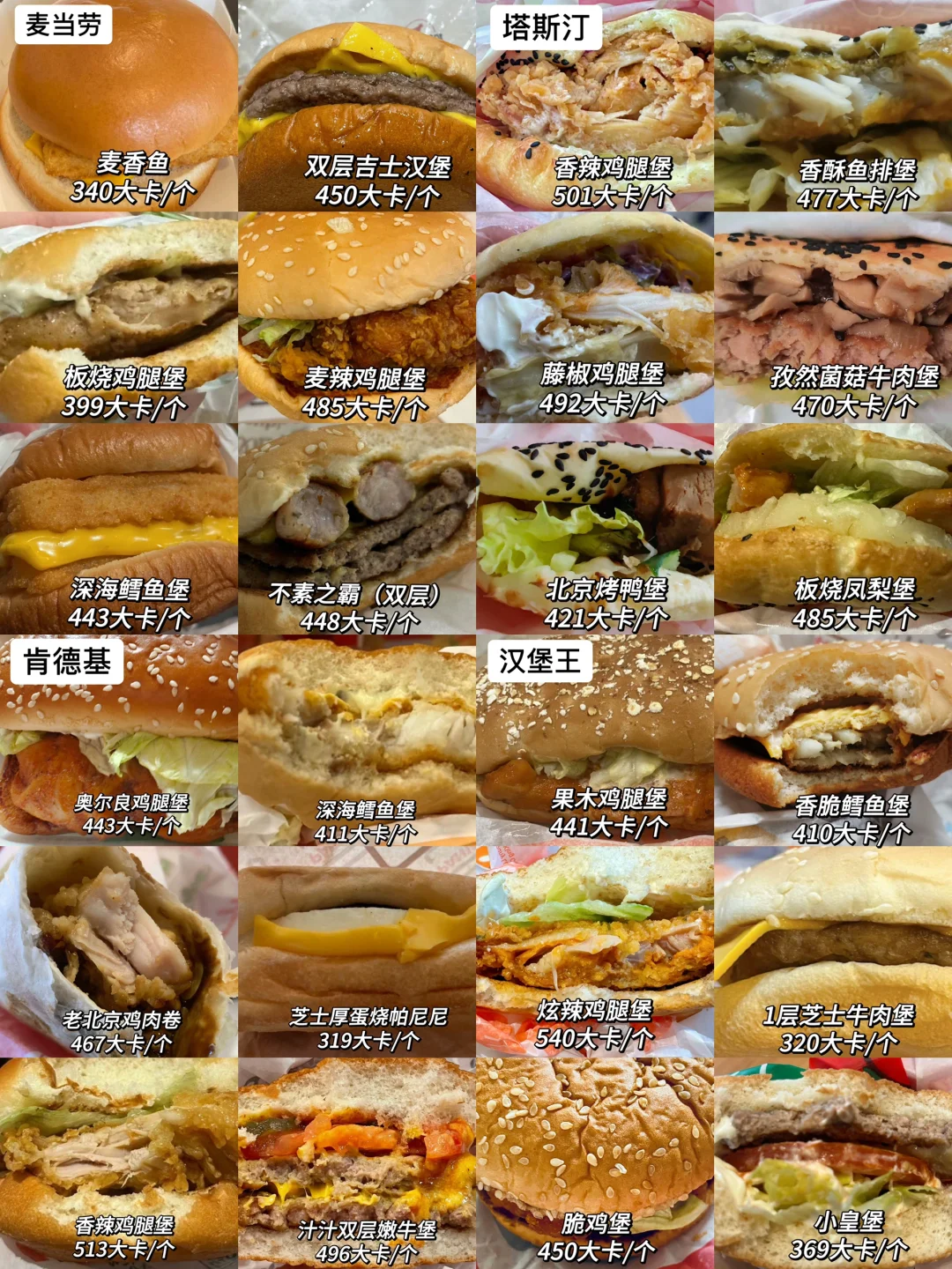 hello 大家好🙋 我是莹莹 一个喜欢研究外食不长胖的女孩👧 总有姐妹说减脂期不能吃汉堡的! 今天整理的是各大品牌500大卡内的汉堡! 具体看下他们的热量是多少吧~ 【麦当劳】(从低到高) 麦香鱼340大卡/个 板烧鸡腿堡399大卡/个 深海鳕鱼堡443大卡/个 不素之霸448大卡/个 双层吉士汉堡450大卡/个 麦辣鸡腿堡485大卡/个 【肯德基】(从低到高) 芝士厚蛋烧帕尼尼319大卡/个 深海鳕鱼堡411大卡/个 奥尔良鸡腿堡443大卡/个 老北京鸡肉卷467大卡/个 汁汁双层嫩牛堡496大卡/个 香辣鸡腿堡513大卡/个 【塔斯汀】(从低到高) 北京烤鸭堡421大卡/个 孜然菌菇牛肉堡470大卡/个 香酥鱼排堡477大卡/个 板烧凤梨堡485大卡/个 藤椒鸡腿堡492大卡/个 香辣鸡腿堡501大卡/个 【汉堡王】(从低到高) 1层芝士牛肉堡320大卡/个 小皇堡369大卡/个 香酥鳕鱼堡410大卡/个 果木鸡腿堡441大卡/个 脆鸡堡450大卡/个 炫辣鸡腿堡540大卡/个 【500大卡怎么吃汉堡?】 1⃣️400大卡汉堡+美式(2-10大卡左右) 2⃣️500大卡汉堡+0卡饮料(0大卡) 3⃣️300-400大卡汉堡+250ml纯豆浆(130卡左右) ✅减脂期可以优先选择煎/烤类的汉堡,优先选择牛肉,鸡肉。尽量少选油炸的,不加沙拉酱。 ⚠️唯一的缺点就是蔬菜可能不够可以在自己准备点小番茄生菜之类的,一顿控制在500大卡就可以啦~ 好啦,本期的分享就到这里啦 我们下期再见👋