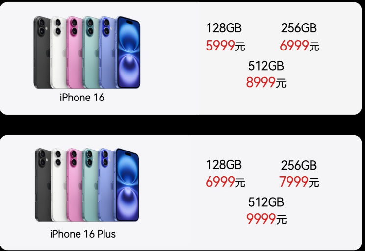 iPhone 16: 128GB 售价 5999 元 256GB 售价 6999 元 512GB 售价 8999 元 iPhone 16 Plus 128GB 售价 6999 元 256GB 售价 7999 元 512GB 售价 9999 元 9 月 13 日晚 8 点接受预购,9 月 20 日正式发售。