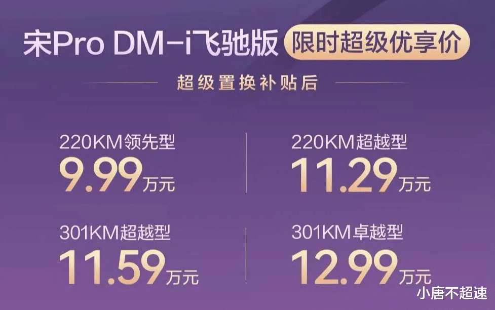 4月22日,比亚迪宋Pro DM-i飞驰版正式上市,共推出4款车型,提供220公里和301公里两种纯电续航版本。