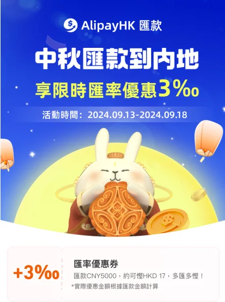 从AlipayHK汇款到内地支付宝,既简单又快捷,尤其是在中秋节还有3‰汇率优惠,真的很划算!