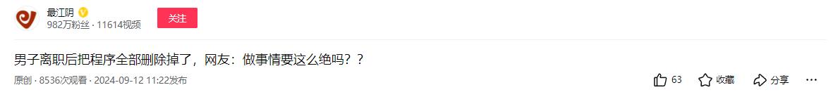 男子离职后把自己编的程序全部删除掉了,老板娘质问:“你都离职了,怎么能把程序删了?那我的车间怎么生产?我的货怎么办?”可男子理直气壮地说:“这都是我自己编的,现在我没在这里干了,凭什么留给你?” 信源:最江阴2024-09-12——男子离职后把程序全部删除掉了,网友:做事情要这么绝吗?? 在当今数字化时代,程序代码已成为许多企业运营的核心,最近一则新闻引发了广泛讨论:一名离职员工删除了自己编写的程序,导致公司生产陷入困境。 这不仅涉及职场伦理,更牵扯到知识产权和法律责任等复杂问题,究竟谁对谁错?员工的行为是否合理?公司又该如何保护自身利益?让我们一起深入探讨这个引人深思的话题。 在一个普通的工作日某制造企业的车间里突然陷入了一片混乱,原本运转正常的生产线突然停摆,工人们手足无措地站在原地,而老板娘则急得团团转,原来刚刚离职的程序员小王把自己编写的控制程序全部删除了,导致整个生产系统瘫痪。 这一举动无疑给公司造成了巨大损失,老板娘气急败坏地质问小王:"你怎么能这样做?这些程序是公司的财产啊!"但小王却理直气壮地回应:"这些程序都是我自己编写的,现在我不在这里工作了,凭什么要留给你们?" 小王的行为引发了激烈的争论,支持他的人认为程序是他的智力成果,公司只是购买了使用权而非所有权,反对者则认为既然公司支付了工资,那么在职期间的劳动成果就应该归公司所有。 这起事件折射出了现代职场中的一个普遍矛盾:员工的个人技能与公司利益之间的界限究竟在哪里?在知识经济时代像小王这样的技术人才往往掌握着公司运营的关键,他们的离职可能会给公司带来巨大风险,特别是当他们掌握着核心技术或重要数据时。 从法律角度来看这个问题并不像表面上那么简单,根据《劳动法》和《著作权法》的相关规定,员工在工作期间完成的与本职工作相关的智力成果,其著作权应当归属于用人单位,这意味着,小王在公司工作期间编写的程序,其所有权实际上是属于公司的。 现实情况往往比法律条文更加复杂,很多程序员会在工作中使用自己多年积累的代码库或算法,这些是否也应该算作公司的财产?又或者如果小王在业余时间完成了部分代码,那么这部分的归属又该如何界定? 这种情况下公司和员工之间的合同就显得尤为重要,一份详细的劳动合同应该明确规定知识产权的归属,以及离职后的保密义务和竞业限制,许多中小企业在这方面的意识还比较薄弱,往往忽视了这些细节,最终导致类似小王这样的纠纷发生。 从职业道德的角度来看小王的行为无疑是值得商榷的,虽然他可能觉得自己付出了大量心血,但突然删除程序导致公司生产停滞,这种做法显然有违职业操守,一个负责任的专业人士,即便离职也应该确保工作的平稳交接,而不是采取这种极端的报复行为。 另一方面这个事件也暴露出了公司管理上的漏洞,作为雇主公司有责任建立完善的信息安全机制,定期备份重要数据和程序,如果公司做好了这些基本工作,就不会因为一个员工的离职而陷入如此被动的局面。 这个案例还引发了人们对于技术依赖的思考,在数字化时代很多企业过度依赖某个关键技术人员,一旦这个人离职整个公司就可能陷入瘫痪,这种情况不仅存在于中小企业,即便是一些大型科技公司也曾面临类似困境,因此建立健全的技术团队和知识管理系统,实现技术的共享和传承,对于企业的长远发展至关重要。 从更广泛的角度来看这个事件反映了当前劳资关系中的一些深层次问题,在竞争激烈的就业市场中,员工和雇主之间的关系往往变得紧张,一些员工感觉自己的付出没有得到应有的回报,而一些雇主则担心核心技术外流,如何在保护公司利益和尊重员工权益之间找到平衡点,成为了现代企业管理的一大挑战。 近年来类似的纠纷时有发生,2019年一家知名互联网公司的前员工因删除公司代码被判刑7个月,并处罚金10万元,这个案例给所有技术人员敲响了警钟:即便是自己编写的代码,一旦属于公司财产,擅自删除也可能触犯法律。 小王删除程序的事件虽然只是一个个案,但它折射出了现代职场中的诸多矛盾和挑战,在知识经济时代,如何平衡个人技能与公司利益,如何保护知识产权,如何建立健康的劳资关系,这些都是我们需要深入思考的问题。 对于企业来说完善管理制度、重视人才培养、建立备份机制至关重要,对于员工而言,遵守职业道德、尊重知识产权同样不可或缺,只有双方互相理解、共同努力才能创造出一个更加公平、和谐的职场环境。