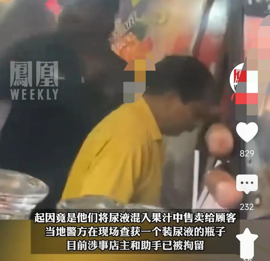 这也太恶心了吧,这简直是把顾客当傻子一样。近日,印度一店主竟然将尿液混入果汁售卖,这不是典型的找死吗?这样的行为真是又蠢又坏,这肯定一下就被发现了,怎么能干出这种蠢事呢? 结果被顾客暴打。 店主和助手被抓,并查获一瓶尿液。 人要是坏到这个份上,那真的是没救了。这样的行为简直匪夷所思,这不是砸自己的招牌吗?这是没事找事。 尿液的刺激性一下就会被发现,竟然放在果汁里面售卖,这真是奇葩中的奇葩。