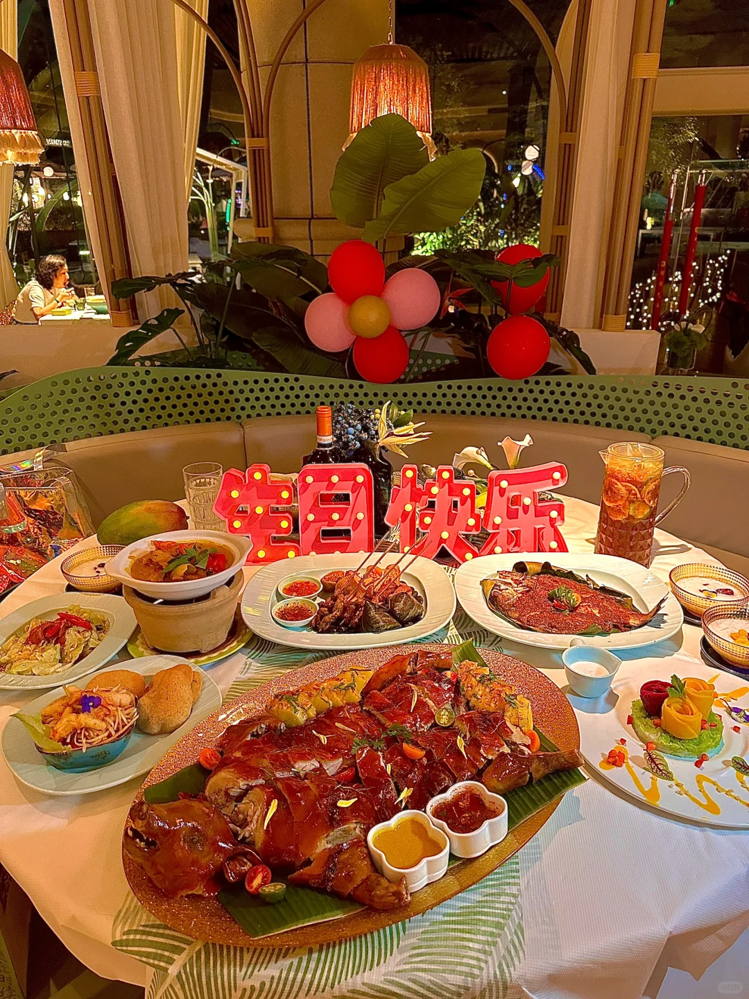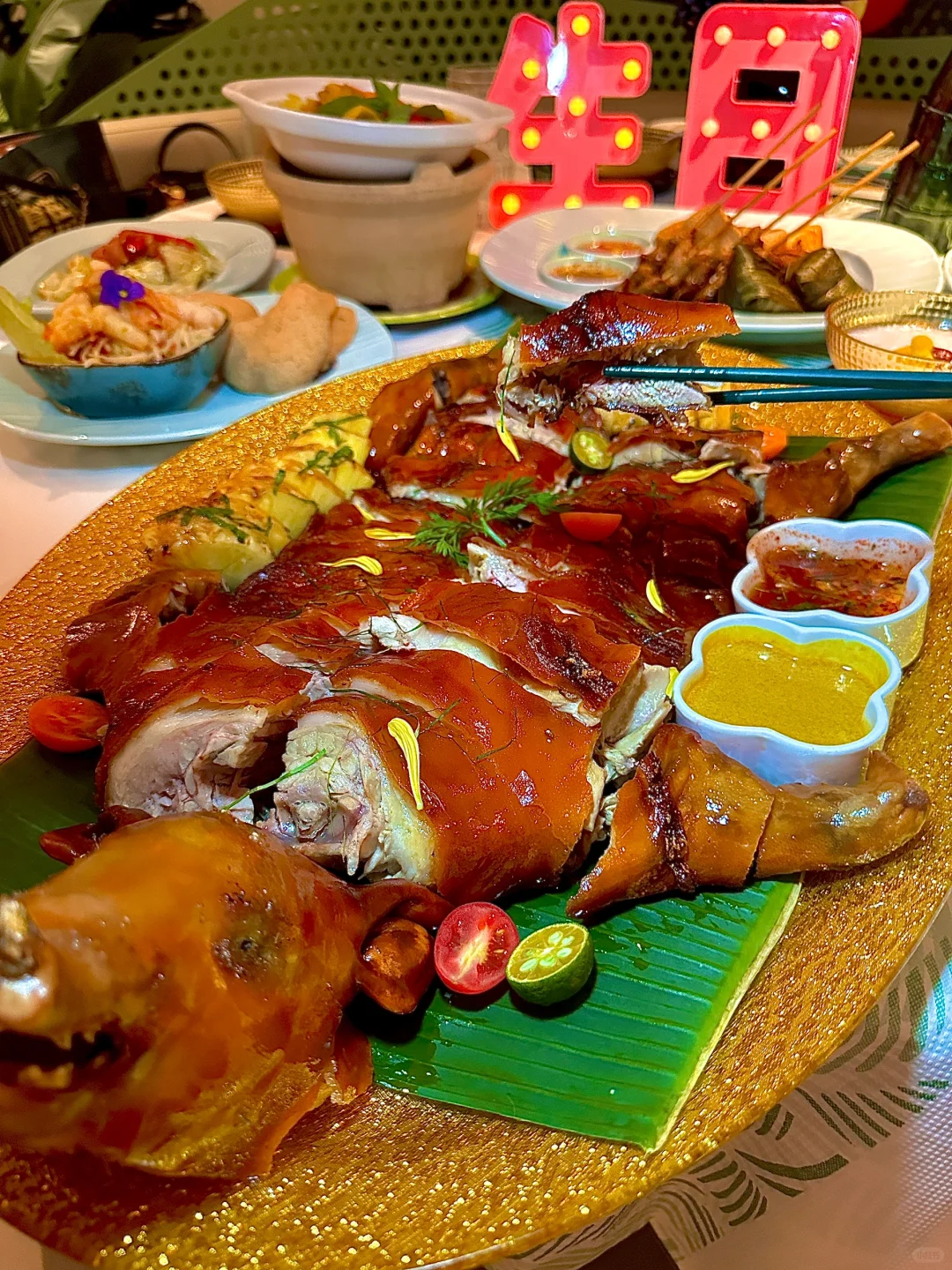 🐖酥皮爆汁乳猪,简直是视觉与味蕾的双重盛宴!一整只金闪闪的乳猪,外皮烤得咔嚓作响,内里肉嫩多汁,是寿星的专属奢华享受!👑