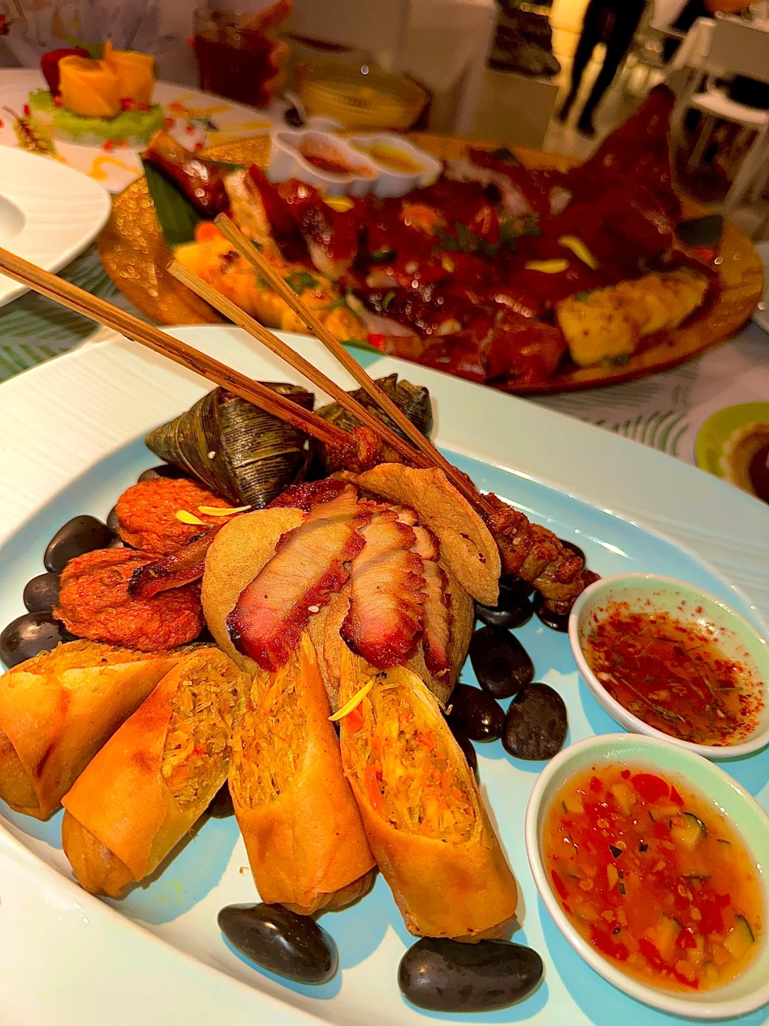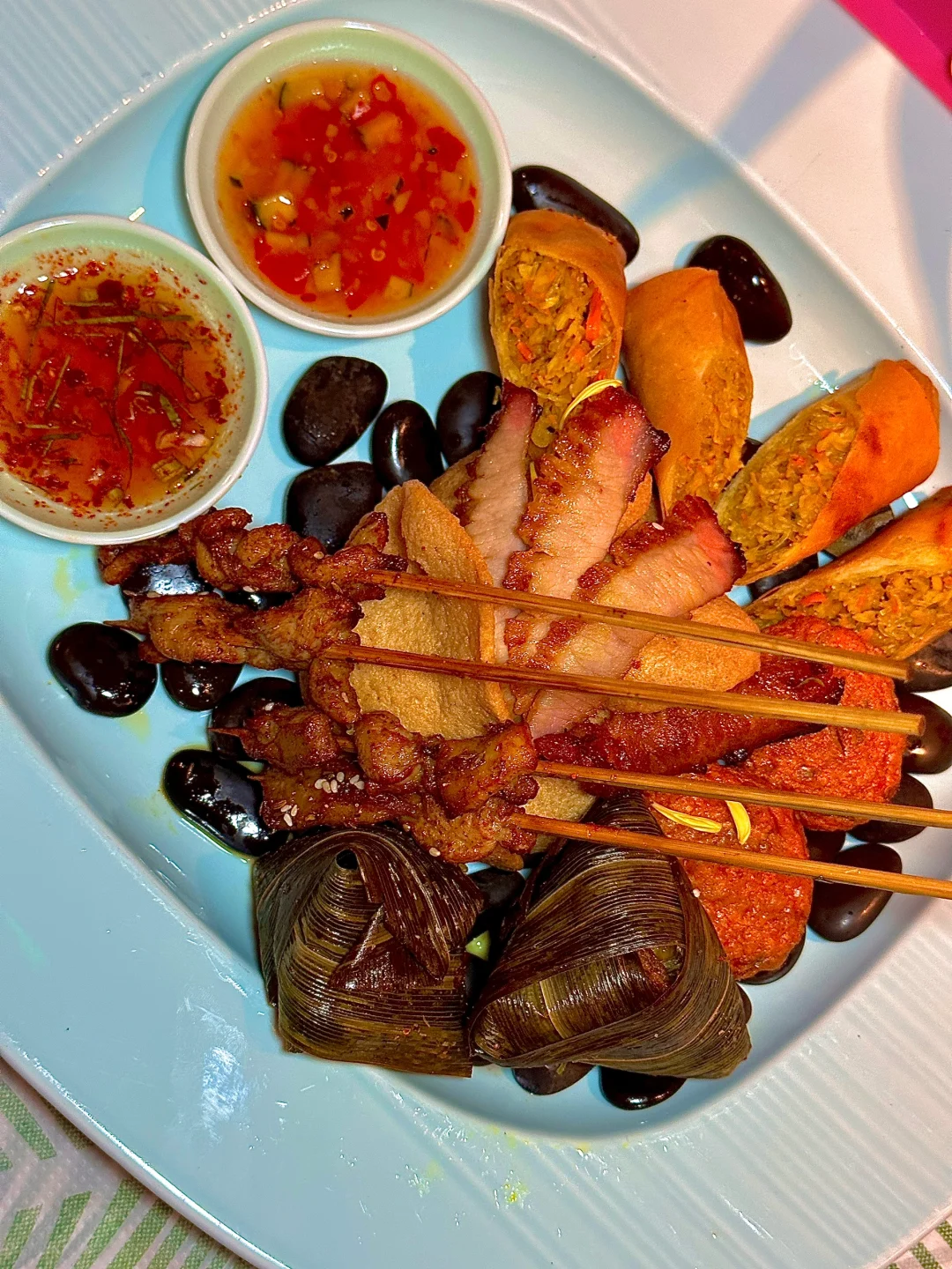 招牌小吃拼盘简直就是选择困难症患者的福音!猪颈肉滑而不腻,牛肉串鲜嫩多汁,还有弹牙的墨鱼饼、脆口的虾春卷,配上虾片,每一样都蘸上那秘制酱料,omg,绝了绝了!🤤回味无穷!