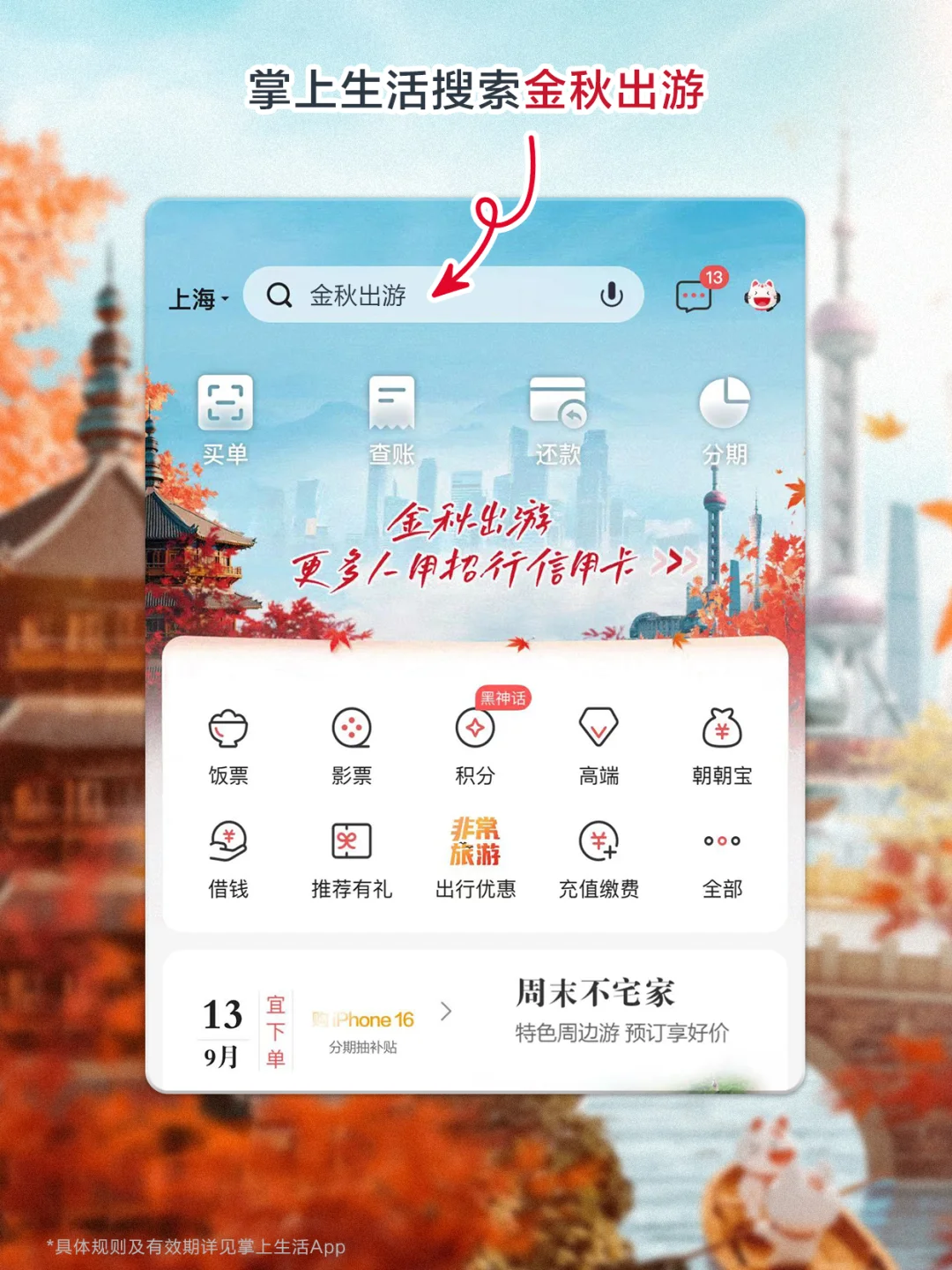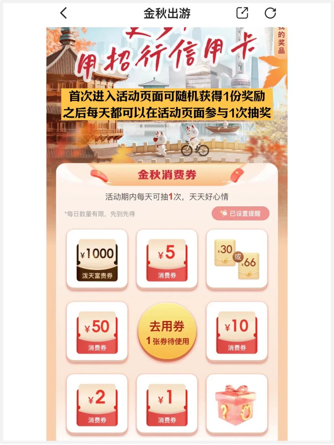 [飞吻R]既然是放纵,那必须再研究下怎么支付比较优惠!最近招行信用卡有“金秋出游”活动,在掌上生活App搜“金秋出游”就能看到,🍂每天都可以抽一次金秋消费券,运气好能还能抽到满2000减1000元券呢,我就准备到时逛街消费的时候直接用~